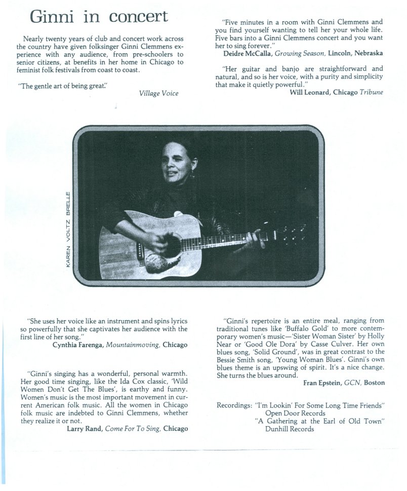 Script for Queer Music Heritage, April 2003 I Charlie Murphy Intro Hello, welcome to tonight's edition of Queer Music Heritage, which I think you'll find will be packed with history and humor. The humor will come in the second half when I'll feature an interview with those dragapella divas, the Kinsey Sicks. The first part of the show will be a tribute to one of the influences of the women's music movement, Ginni Clemmens. I've been planning a segment on her for quite some time, but now it carries a special sadness, because she was killed in an car accident near her home in Hawaii on February 15th, just a few days before her 67th birthday. Before I get into some of the history of Ginni, I want to play a song she recorded on a various artists compilation. The compilation was called "Gay & Straight Together" and she produced this album in 1980 on her own label, Open Door Records, in Chicago, and Folkways Records also issued the album that same year. The album included Charlie Murphy, who you heard in my intro, and several other artists I've played in the past. Again, it was called "Gay & Straight Together," and with her typical spirit she wrote on the album notes that it was brought into existence to promote understanding, acceptance, and support between different lifestyles. The album contained a mix of gay and straight, young and old, and male and female artists, and for her own song on the album, Clemmens chose one written by folksinger/songwriter/activist Malvina Reynolds, called "Love Somebody." Ginni Clemmens - love somebody (1980) Ginni Clemmens had a long history in music, and it went back much further than her involvement with the Women's Music Movement. In the late '50s in Chicago she got started in folk singing, but she did not limit herself to one style. For example, she decided to take up the banjo, not your typical woman's instrument in those days. And she also included blues songs in her performances, which she continued to do throughout her career. But she wasn't a full-time musician. She was also a recreational therapist working with retarded children. And she found that music, and especially getting them to sing together, was a useful way to reach them and to help them feel less alienated from one another. This led in 1965 to her first album, called "Sing A Rainbow & Other Children's Songs," on the Folkways label. Here's a bit of one of the songs from that album. Ginni Clemmens - sing a rainbow (1965) So, by the late '60s and early '70s, she had progressed from folk and blues to children's music, but for the people who like to classify artists, she was about to confound them even more. Here is a quote from her that explains the catalyst to her next progression. "I heard Cassie Culver sing, and Margie Adam. And they were singing songs coming our of a feeling of strength and integrity in being women, and it gave me a different perspective on what it meant to be a feminist. I saw that it didn't have to be man-hating, but rather a belief that women could be strong, and independent if they chose to be, and that it was important that they have that choice." This realization led her more and more toward performing at women's gatherings, meetings of the National Organization of Women, and feminist conferences. One of her most known blues songs was also one of her first feminist songs, "Wild Women Don't Get The Blues." It was written by Ida Cox in the 20s and using it to promote feminism, Ginni Clemmens brought a whole new meaning to it. Ginni Clemmens - wild women don't get the blues (1981) Ah, yes, those wild women don't get the blues. That song was one of the staples of her repertoire, and she recorded it twice. The first time was a more acoustic version on her 1976 album "Long Time Friends," and then she recorded the version you just heard and made it the title track of an album in 1981. But her influence went further than just her songs. You've heard me mention many times on this show of Ladyslipper Music as being one of the main sources for recordings by lesbians. I was able to get some short interview comments about Ginni from Laurie Fuchs, who was the primary founder of Ladyslipper. In 1976 Laurie began Ladyslipper because there just were no sources for women to buy the early recordings from the artists they would hear about or see at the women's festivals. So, as you'll hear, Laurie started a mail order business, which is still going strong today. You can find it on the net at www.ladyslipper.org. Laurie starts out her comments by telling about her first exposure to Ginni Clemmens. Laurie Fuchs Comments on Ginni Clemmens: When I went to the first festival for me, which was 1976. It was actually the 3rd National Women's Music Festival, in Champaign-Urbana. For some reason, one of the strongest memories I have is round robins just cropping up, and there would be Ginni, with her banjo. And so from that time many many people went away from this festival just being very inspired to go home and start something as their participation in cultural and political we considered it cultural and political work at the time. And I really think that Ginni Ginni's presence helped foster that feeling of this being something that we were all invited to participate in Can you tell us something about the influence of her music itself? There were a few things that were really notable on her early LP "Looking For Some Long Time Friends" that I remember. One was that she performed a song called "Lady-O," I think this was by someone called Judee Sill. But it was one of the really early lesbian songs that I ever heard. And I think the title of her LP, "Long Time Friends," sort of captured some of the spirit of the early women's music and culture movement. And another thing that I think she contributed was there was a real sort of do it yourself sense that she brought to this. Women started making their own cassette tapes and just sort of doing some general things that have become much more popular 