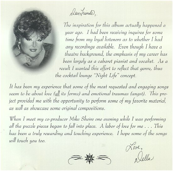 mygayweb.com Definitely the Gal about "town" here, she's a singer, songwriter, pianist, performer, actor and an MC who's been delighting audiences for years! "Whenever Drag is mentioned in the Twin Cities, the one name that immediately pops into the conversation is "DELLA CATESSEN! ". Definitely the Gal about "town" here, she's a singer, songwriter, pianist, performer, actor and an MC who's been delighting audiences for years! This self-professed "late bloomer" swears that she started doing drag professionally a few years ago, as the result of a friends dare. Now, beauty queen hopefuls tremble at the mention of her name." I have never taken any offense to being called a "drag queen" (depending on if it is said in a mean way or not), but it all depends on how you emphasize the words. For some people "drag queen" conjures up some negative images. On the other hand, there are those who feel that "Drag Illusionist" or "Female Impersonator" sounds a little hoity-toity, as if somehow elevating themselves above the rest of the crop. There are a lot of different "levels of drag", from casual "street drag", to the professional performers (Illusionists, female impersonator, etc.) that make a legitimate living at it. Using some of those fancier terms does add more legitimacy to what a performer does and thereby making it more appropriate to use. Hmmm, that's always been a bit of quandary for many of us. It is surprising how touchy some people can get about this topic. I guess that it really depends (like so many labels), on who is saying it and in what context. For myself, I am glad if they call me at all! I guess I just like to be referred to simply as a "performer", or "impersonator", because that really is what I am and what I do. However, I suppose that "Professional Glamour Puss" would also be appropriate! I think that this was something I was born with...like being gay. I never tire of of the audience and they give me so much more than I could ever possibly hope to give back. One of my early distinct childhood memories was as a toddler. I was a very shy and rather lonely child. Mom was a beautiful and charming woman, with definite glamour all her own. I would sometimes lie on the sofa with my head in my Mom's lap and watch her read. She would also read the old "Photoplay" magazines aloud to me sometimes. I would see pictures of the glamorous female movie stars and ask all kinds of questions about their lives. I was mesmerized, as she would relate to me the stories and trivia about these glamorous icons. She loved it too. Often we would chat for hours about Hollywood and movies, and music. She had a beautiful voice too, like a young Rosemary Clooney, and she would sing popular songs and show tunes to me. Then I would sing them back to her. She would applaud and delight in my antics. I think that Mom was my first real audience, and it helped give me confidence. Little did she realize that she was sowing the seeds that later would take root into the entertainer I am today. Unfortunately, most of my family is gone now. We were a very small family to begin with. My younger (and only) brother died suddenly almost 3 years ago at a young age. I am sorry to say that my father was an alcoholic and physically and emotionally abusive, and my parents finally divorced after being married way too long. My Mom is 80 and has had a couple of strokes and other health problems. But she is very young acting and looking for her age, and she has an amazing attitude about life. The last 2 years she has lived the majority of that time with me, and then gone to her condo in Florida for the winter where she had some other help. She and I are so fortunate to have a very unique and wonderful relationship. We are much alike in many ways, and fortunately we enjoy each other's company as well. I came out to her when I was 20, and there were really no problems. Her biggest issue was that she wanted so much to be a grandmother to my children, which didn't happen. I can relate to her disappointment because I have always wanted to be a parent myself. I believe I would have been a good parent, but I think it might be too late for me now. I am lucky, and proud to have the kind of open and honest relationship Mom and I do. I really believe that I was blessed to get her as a mother. She is a totally accepting person and knows all about Della. In fact, she helped me make my first Pageant gown! When she was living with me last year, I would come upstairs to say goodbye before I would leave for work, and she would give me the once over and critique my look. Sometimes she would say, "Oh, I just love your hair that way", or, "are you sure you really want to wear those earrings with that outfit"! I would just crack up! As for any love relationships, it has been a little while since I was "in" love. I do date when I can, and am open to more. I am very pleased that I have had two wonderful men that I have deeply loved in my life. If it doesn't happen again for me, then I am very grateful for having experienced true love, even once. If it happens again all the better! But one thing I have learned is, you can't make it happen. When it is time, it will come to you. Jeez, I am being awfully philosophical! I was performing vocal solos in an adult choir when I was only eight years old and been performing professionally in nightclubs since I was seventeen, as my alter ego "Chaz". I have sung and played piano in nightclubs and supper clubs right up until I began working as Della almost eight years ago. I also have a very strong theater background, and had performed in lots of shows, including a season in repertory at the world renowned Tyrone Guthrie Theater. I have also written, performed, and produced several local and national radio jingle Ad's. Plus when I was thin, (yes, I really was thin), I did a lot of fashion and catalogue modeling as well as some packaged products that were nationally distributed. So as you see, the performance arts have