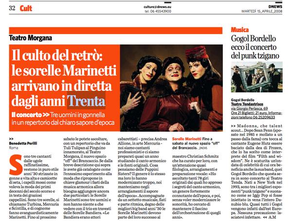 The group contacted me and graciously sent their CD, and I asked them where their name came from and how to get the CD: Dear JD, Filippo Tommaso Marinetti was the conceiver of the cultural movement Futurismo, back in the 1910s. http://en.wikipedia.org/wiki/Futurism. We pretend that the Sorelle (sisters) are related to him. The record should be available on iTunes for everyone interested. But it is also possible to order a CD copy writing to our company: