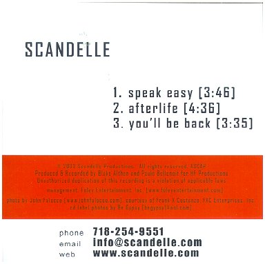 CUED UP: Scandelle from Next Magazine (NYC) 3/24/06) Forget him not New York has a way of forgetting about you. Fast. You have to work hard to make it in Manhattanceaselessly, tirelessly (Sinatras city that never sleeps lyric wasnt a cute asideit was a warning to would-be dreamers to tread with conviction). It could take years to establish yourself here and years more to attain successbut even then youre not in the clear. This is New Yorka place where a decades-worth of work can be erased in less than 12 months. Just ask Scandelle. A lot of people dont know that Ive been on the scene since 1988wigless, singing live, carrying on and all of that, he says. Even a bald black diva in mascara related to the late pop great Otis Blackwell isnt safe from Gothams absent-mindedness. But after being out there for almost 11 years every night either performing or doing some kind of madness, I took a sabbatical that ended up lasting seven years. When I decided to come back in 2003, I found things had changed quite a bit. I had to do things really differently; New York was a different kind of town. So Scandelle
