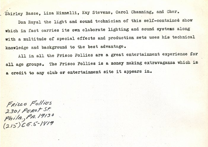 of photos from the Frisco Follies sent to the Gold Dollar in an attempt