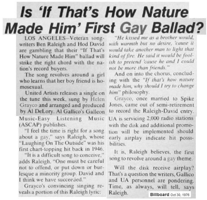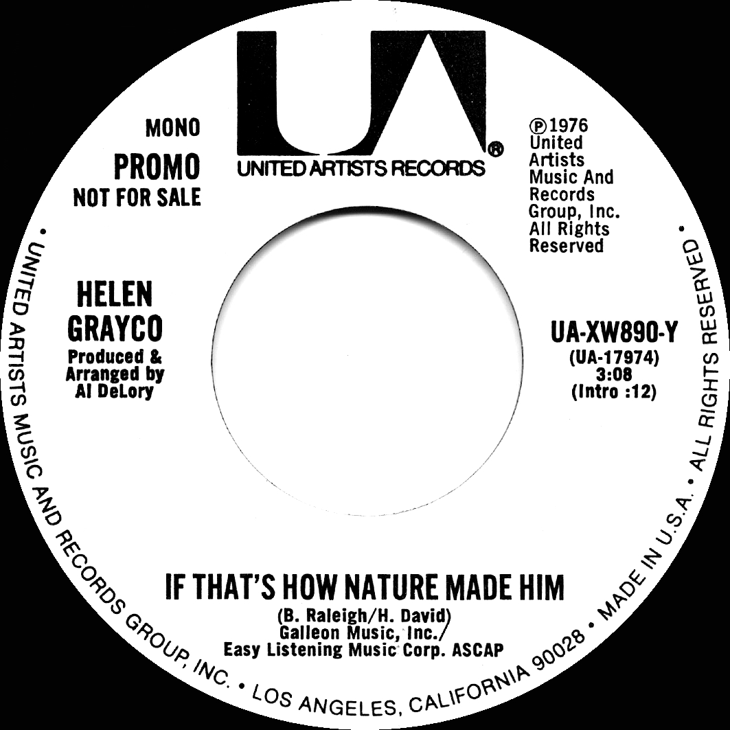Grayco - "If That's How Nature Made Him," 1976 Took me six years to track down a mp3 of it, and then that was only via posting a plea for it on Facebook and Rex Strother asking music maestro Bob Moke it he had it, he did indeed, even sent me label scans. By the way, the record did not chart on Billboard or Cashbox, but when it was re-issued on a different label (Number One Record Company) it did in December 1977, made it to #90. Of course from producing the radio show Queer Music Heritage for 15 years I'm all about obscure gay songs, and this one was surprisingly progressive for it's time. Helen Grayco had not really done any recordings for about 20 years and is mostly known now as having been married to Spike Jones.