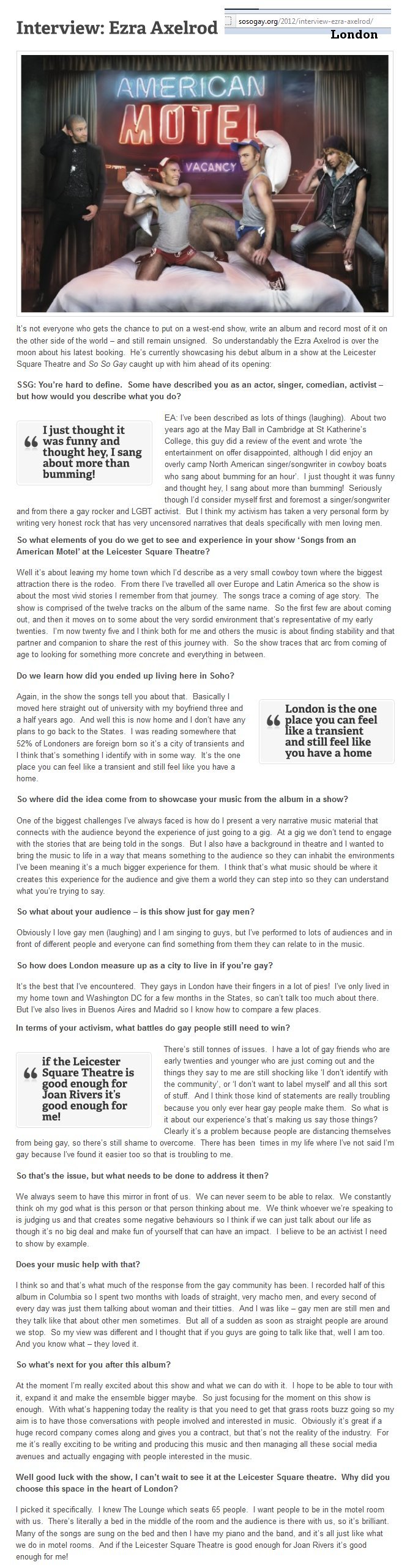 JD: I gather from your website you spend a lot of time in Columbia. EA: Yes, my husband is Columbian. JD: Have you done much performing in that country? EA: Yeah, this past winter, not this current winter but last year, I recorded the first six tracks of the album in Bogota, and was working with a producer in Columbia and I thought it would be really wild to Columbia for two months to record, and it was. And then I did a big concert at the end of that in Bogota, which was really amazing. A lot of people came to it and they were people I did not know, that read about the concert in the paper and just showed up to check out this American artist. And it was really cool. JD: How would you compare again, talking about you as an openly gay artist how would you compare the acceptance in Columbia versus the UK? EA: Well, I think that the entertainment industry is similar in a lot of countries. Generally I think people are pretty nervous about explicitly gay content in broadcast to a mainstream audience. But again, I think audiences, audiences that are theatre-going, or go to music concerts, they can handle a lot. So I think you should never listen to those fearful voices. You should always look to your audience and have faith in them. And that's what I did in Columbia, and there were lots of old people, straight couples in the audience, and they loved it. They come and they hear music that they really enjoy, and they enjoy seeing a young person being so comfortable in his own skin. JD: You briefly mentioned your stage act and I want to hear about that. I understand it's more than just singing. EA: Yes, well I wanted to do kind of a theatrical show that told the story behind the songs on the album, and I wanted the show to take place in a motel room, with this group of musicians. And so what happens in the show is that the stage is set up like my motel room, and then my band breaks into my room. I'm in the shower and they're harassing me. We'd just played a gig and they're harassing me and want to party with me, and I come out of the shower and we start jamming, and we start playing the songs on the album. And then between the songs I do this kind of stand-up comedy banter that's based on the stories that inspired the songs. JD: So, did you get dressed when you came out of the shower? EA: (laughs) Yes, I get dressed. JD: I'm so disappointed. EA: I do get dressed on stage though. I come out of the shower in a towel. JD: What part does sex appeal play in the marketing of your music? EA: Well, I think you could do a little google search to find out about that if you want to. JD: Oh, I did find an article in the Gay Times with you just wearing briefs. EA: There you go. Well, you know a lot of these songs are about they're sexual songs, they are about sexual topics. For me, I'm only portraying an aesthetic that is definitely there in the lyrics, so I don't have any qualms about anything that I've done. But that's kind of one of the hard things about marketing to a gay audience. You're almost expected to get into your underwear if you want the coverage. JD: Yeah, I've always hated that .not. EA: You know, it's great right now, you're asking me about my songs and the stories behind them, that's actually a rare occasion. It's rare that we ever get to that because it's usually, just tell us about your underwear. JD: do you have any stories about a particular gay song of yours and the reaction it got? EA: Well, I think the first very explicit gay song that I wrote was "Around Here." So, "Around Here" is about an affair between a student and a teacher, and apparently that's a very common experience for a lot of gay men, is that some of their first interactions, sexual attractions are actually with teachers. And the song's pretty explicit, and I remember when I was first performing it, and recording it. I was recording it in a studio and people they were concerned that people weren't going to be ready to listen to a song like that. EA: And when I perform that song, so many people say, my God, that's my favorite song, both men and women, because a lot of people have either had affairs like that or they had crushes on teachers, so they really identified with the content. So I guess what I'm trying to say it's another example of where people on the music side of things are concerned and worried about audiences and then the audience is really happy and they are happy to finally have a song that they can relate to and that touches upon an experience that they've had. Ezra Axelrod - Around Here (2012) That's right, and I thank Ezra for the interview and encourage you to check out his website at www.ezraaxelrod.com, and don't miss his videos. And please don't forget there are more segments of OutRadio this month found on my site. Here's one more song to take us out. JD: I love the harmonies in "Take Me Home" the song is sexy and gorgeous. EA: Thank you. It's my favorite actually on the album, the most recent song I've written and it's about being kind of lost in the California desert this past March, with my husband right before we were coming back to London and kind of looking back on this really long journey that we had together, which has been the story of my album. So I thought it was a very good way to end the album. Ezra Axelrod - Take Me Home (2012) See bottom of the page for two articles about Ezra, from Time Out London.