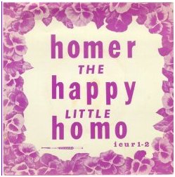 And this is a good time to mention one of our mysteries. In the early 1960s a record label called Camp Records released two albums and a dozen 45s, pretty much exemplifying camp humor, with all of its mincing stereotypes. They were very coy on the album jackets as to who the singers really were, either, they said, as an attempt at protecting them or perhaps, I think, hyping the product. Who knows? And who knows who were really behind the label. All the singers' names were obviously made up, like B. Bubba, Sandy Beech, Max Minty & the Gay Blades, and this one, by Byrd E Bath. It's called "Homer the Happy Little Homo." Byrd