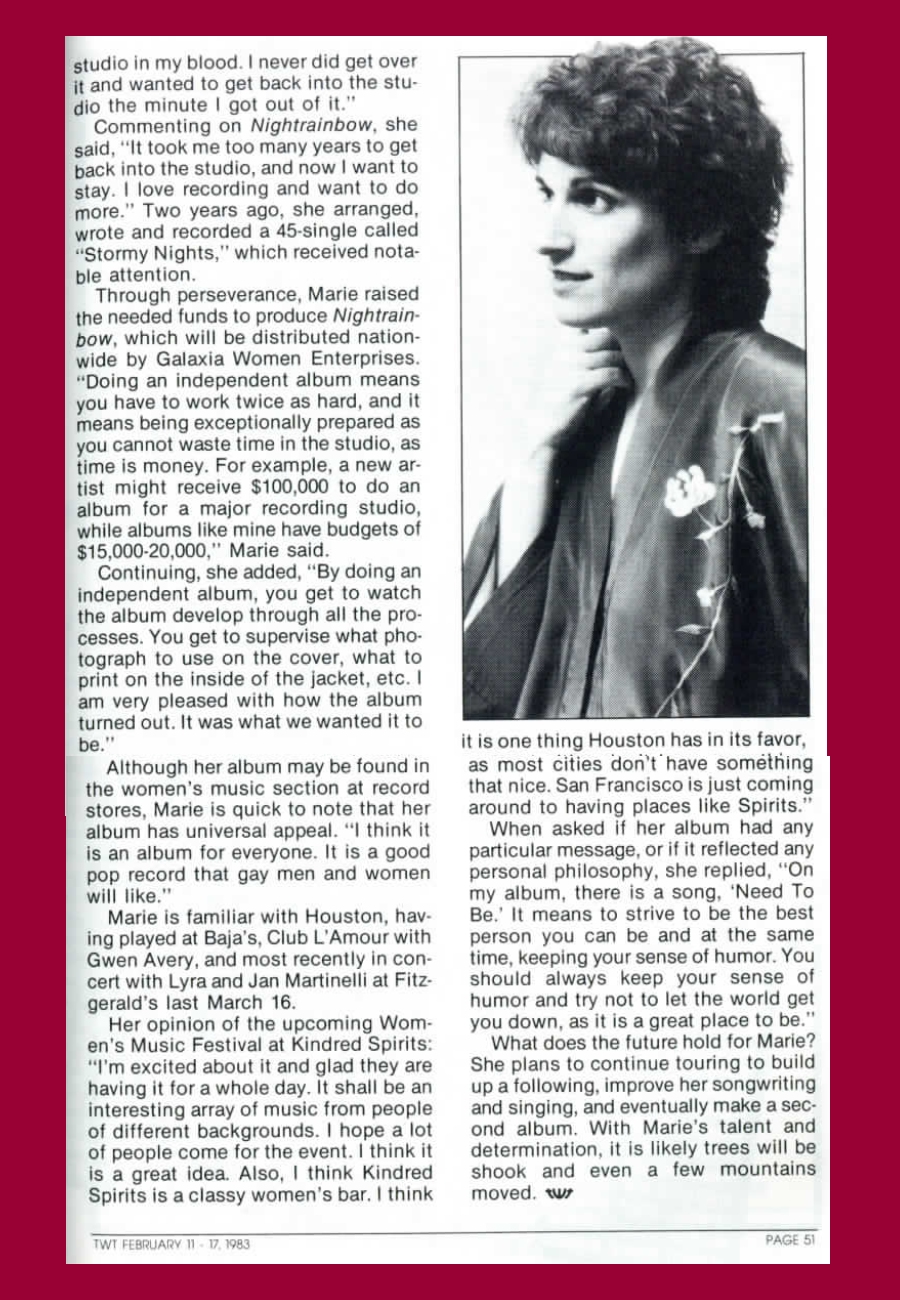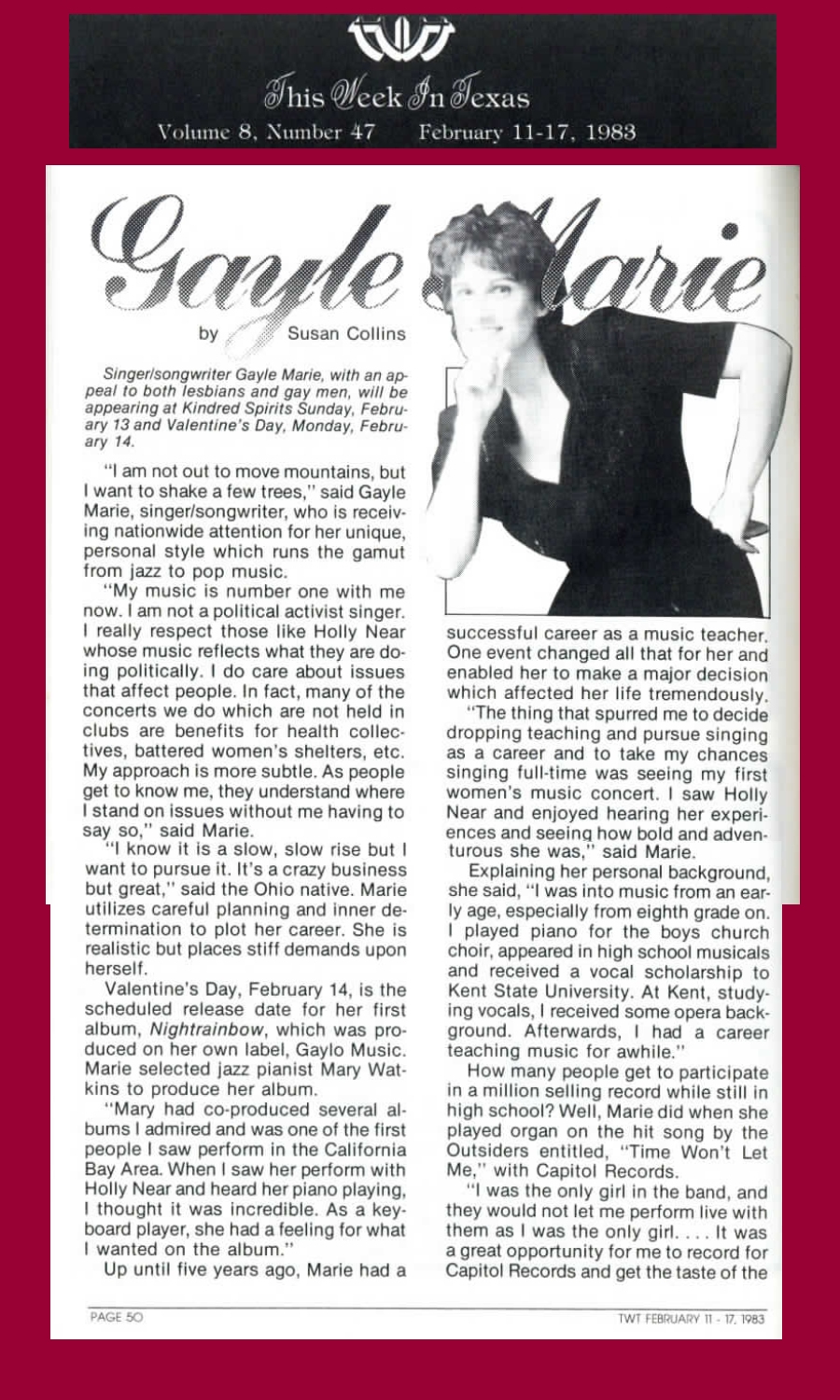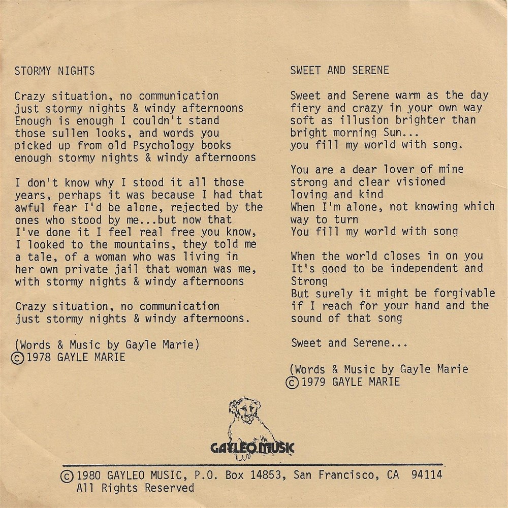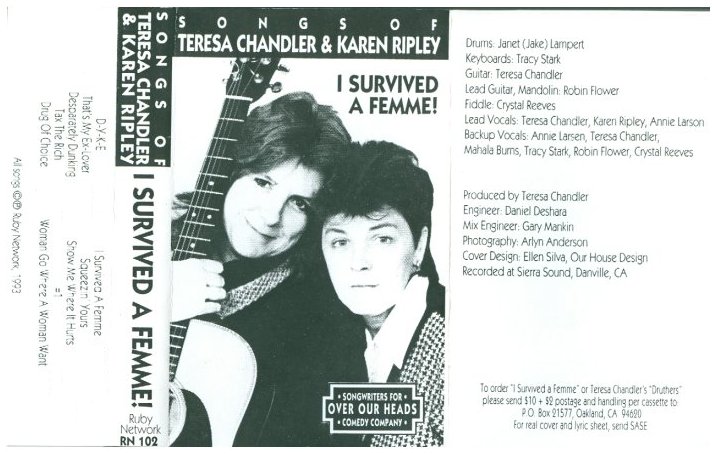 \And that was Gayle Marie and a track from her 1982 album, "Night Rainbow." It was called "Stormy Nights," and she got some help on backups by Gwen Avery. And, you heard Teresa Chandler & Karen Ripley on Part 2 of the show, when I played a song from their 1994 cassette "I Survived a Femme." This time I'm sharing with you the title track. Teresa
