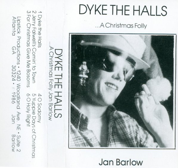 Perkins - Superdyke (1976) After Polly Perkins and "Superdyke" came a very short song from a movie from 1976 called "The First Nudie Musical." Among the so-called stars were Cindy Williams, just before she started filming "Laverne & Shirley." And the song "Lesbian Butch Dyke," sung by Debbie Shapiro, lasted only 54 seconds. And closing that set was Melinda and the title track from her 1994 cassette "Dyke Dramas." Yes, I know it's only September but I have a couple of Christmas dykes for you. From a very, very rare 1986 cassette tape by Jan Barlow is the title song, "Dyke the Halls." And she'll be followed by an act that really can sing. Jan
