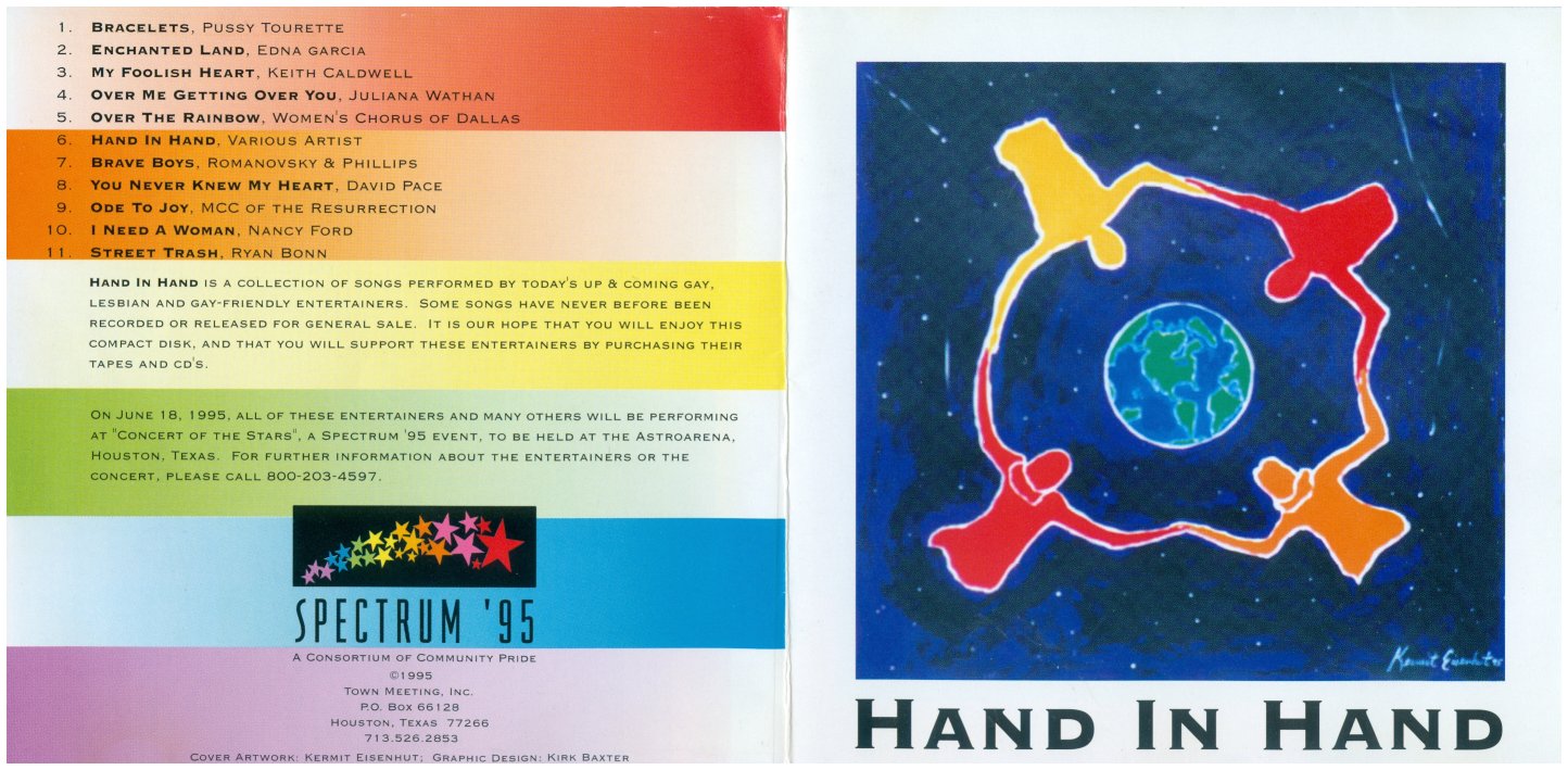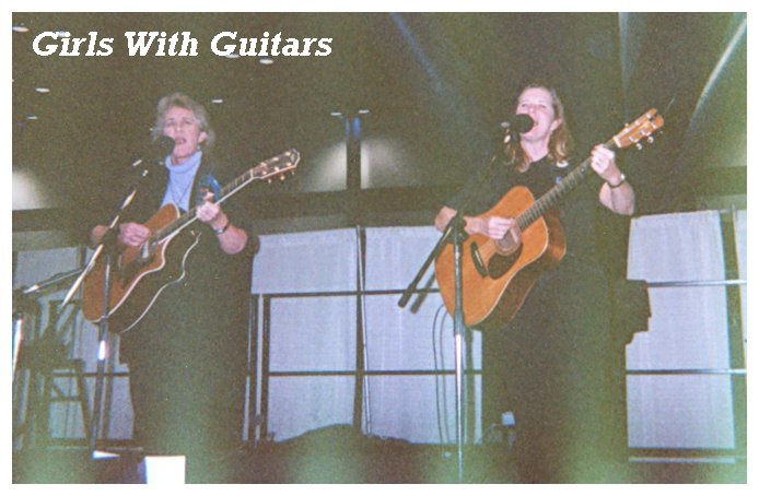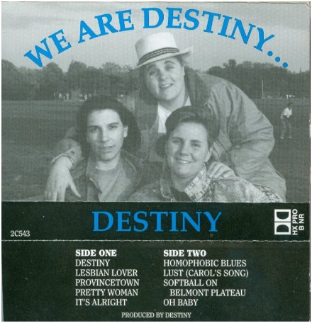 Click to Hear the Above Concert I turned that into a Houston, Texas, set, and in the middle were Girls With Guitars. No, Girls With Guitars is what Ferryn Martin and Kelly Wallin called themselves, and the songs "By My Side" and "Mine All Mine" were from their 1996 CD "This Is The Life." Then, okay, this next performer is a friend of mine, for a lot of years, Nancy Ford. She's known in Houston for her performances that she calls "The Dyke Show." Back in 1995 she was one of many artists who participated in a project named Spectrum '95, kind of a gay music festival, and a various artists CD was released, called "Hand in Hand," which is now quite hard to find. Nancy Ford's contribution was "I Need a Woman," which I believe, she still does. And coming up are two women's softball songs. There was a trio in 1992 called Destiny, made up of Mary Jo Paranzino, Mary Apt and Diana Bitting, and their cassette was called "We Are Destiny," and it was terrific. I'm playing the song "It's Alright," and then their softball song, "Softball on Belmont Plateau."