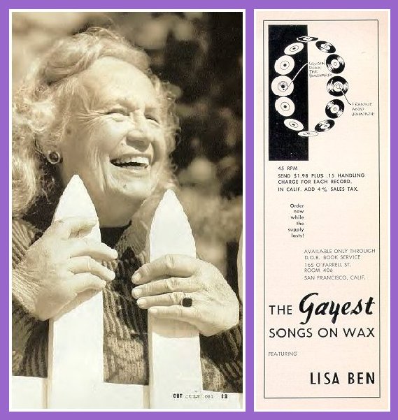 Click for LP and liner note scans for Carole Etzler LPS That second, and very short song was called "Women Loving Women," and is from the 1976 LP "Sometimes I Wish," by Carole Etzler. And one of our earliest lesbian music pioneers is actually more known for her contribution to lesbian journalism. In 1947, going by the pen name of Lisa Ben, which is an anagram for lesbian, Edith Eyde created, published and distributed the very first lesbian magazine, which she called Vice Versa. Nine issues were done, through 1948, and by the way, you can read them all on my website. But Lisa was also an entertainer, and loved to especially sing parodies of known songs, done with a lesbian twist. Her music appears in several gay & lesbian documentaries, including "Before Stonewall." She wrote original songs as well, and the Daughters of Bilitis issued one of them on a 45 rpm record, in 1960, as a fundraiser. Here's "Cruisin Down the Boulevard," and its flip side, "Frankie & Johnnie." Lisa Ben - Cruisin' Down the Boulevard / Frankie & Johnny (1960)