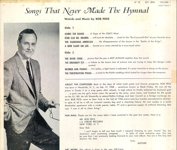 Curley Farrell - Fruity Brucey (1978) Following "Fruity Brucey" was "Hopalong Sissy." That one was, at least according to the label, by Bruce Poose, from 1981. And also you heard one that got a bit of radio play in 1974 was "The Ballad of Ben Gay" by Ben Gay & the Silly Savages. And here are two more quick examples. In 1967 comedian Peter Dana couldn't resist doing a parody of Roger Miller's "King of the Road" Peter