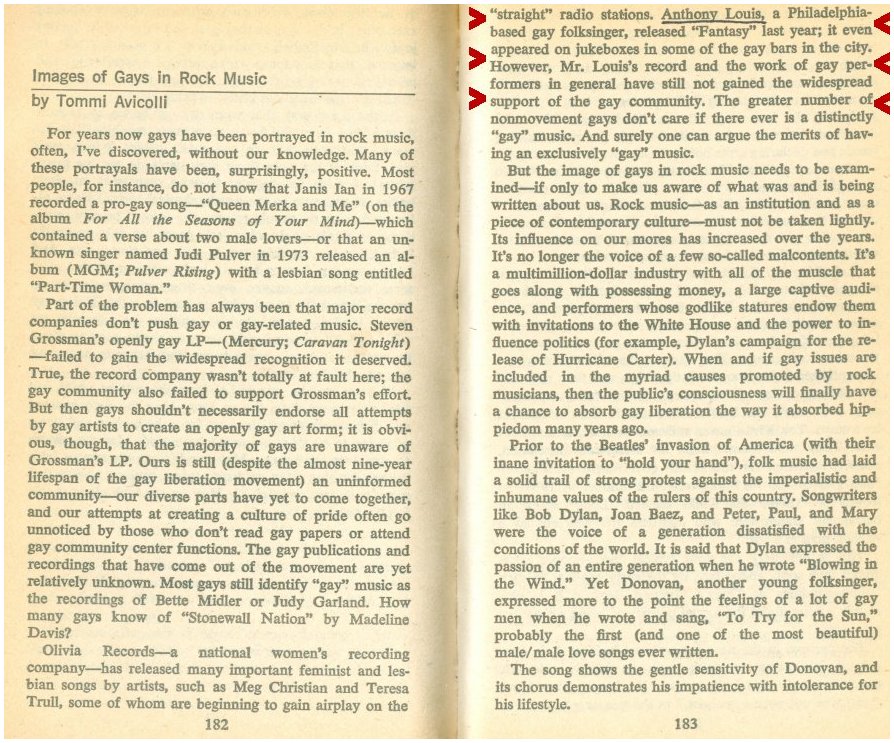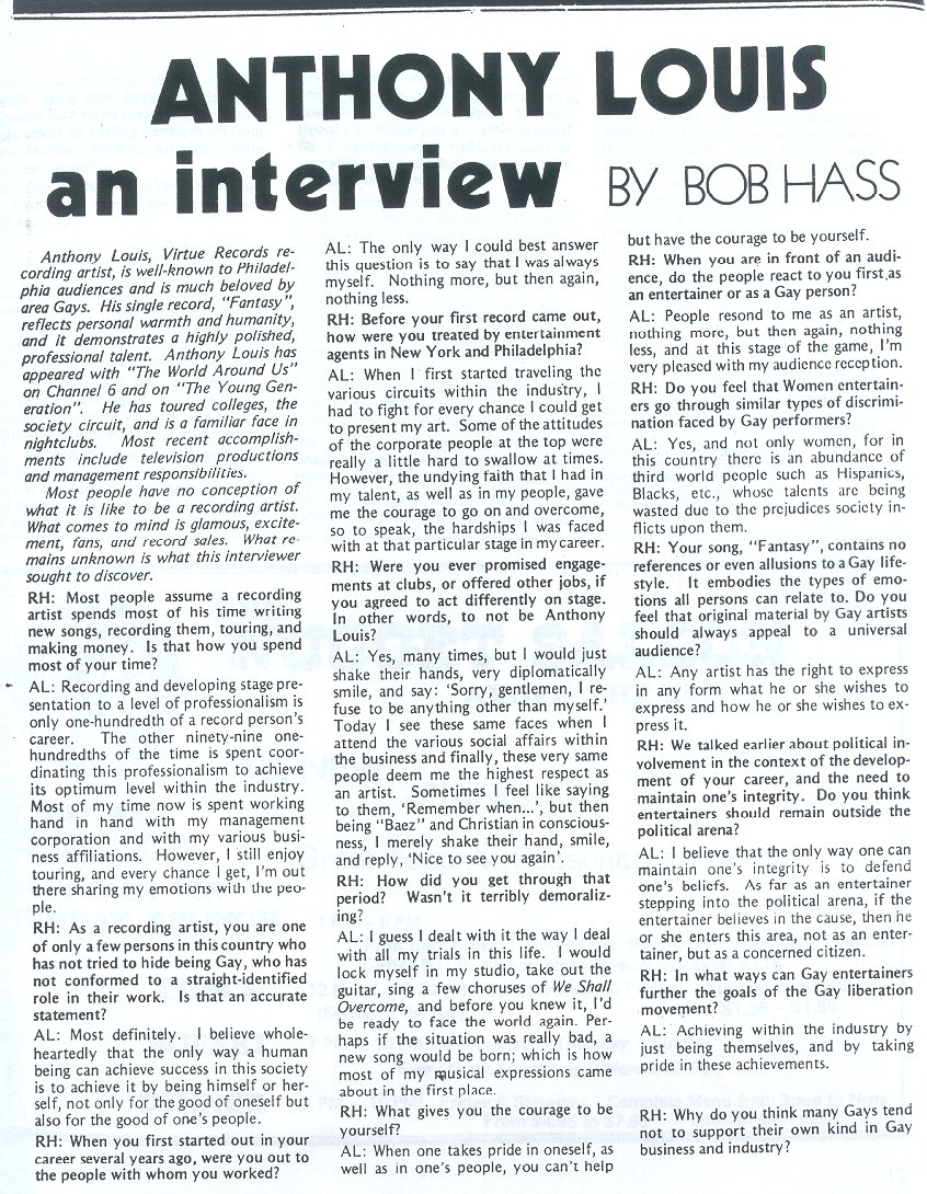 I first read of Anthony Louis in an essay by Tommi Avicolli in the 1978 book "Lavender Culture"