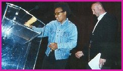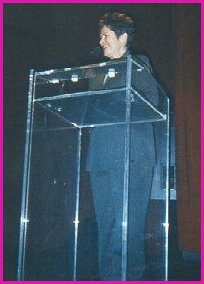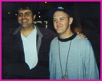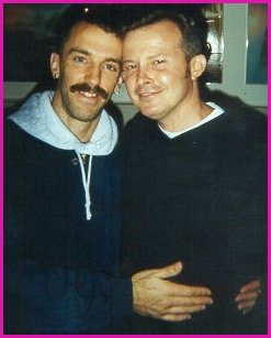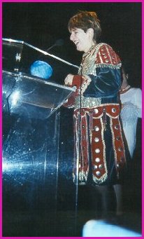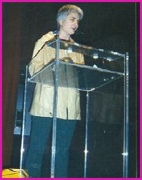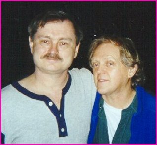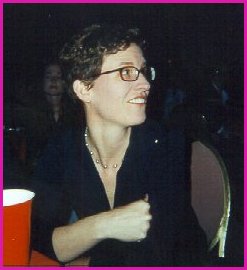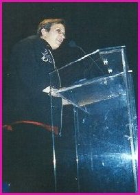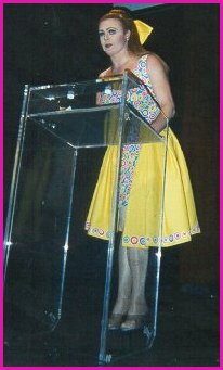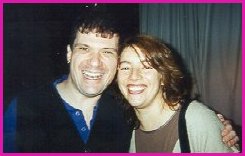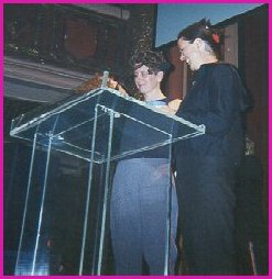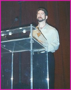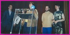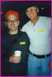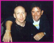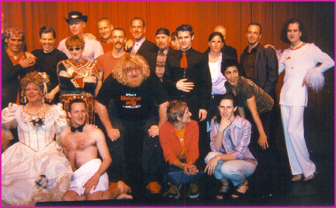 ...a much smaller group of artists and presenters than the year before were organized enough to assemble for the pic, but I can pick out in the top row, Dave Hall, Angela Motter, Scott Free, Barnes and John Boswell, behind Sonia and Mark Weigle. Next to John was Patrick Arena, Danny Pintauro (the kid from "Who's the Boss" who turned out gay), and, I don't know the others in that row, or anyone in the front row except, of course, the show's host and center square, Bruce Villanch...oh, yeah, the guy with just a towel was a presenter, representing the gratuitous musical "Naked Boys Singing." (if anyone can help identify the unknown others in this or the 1999 pic, please write me). |