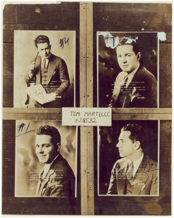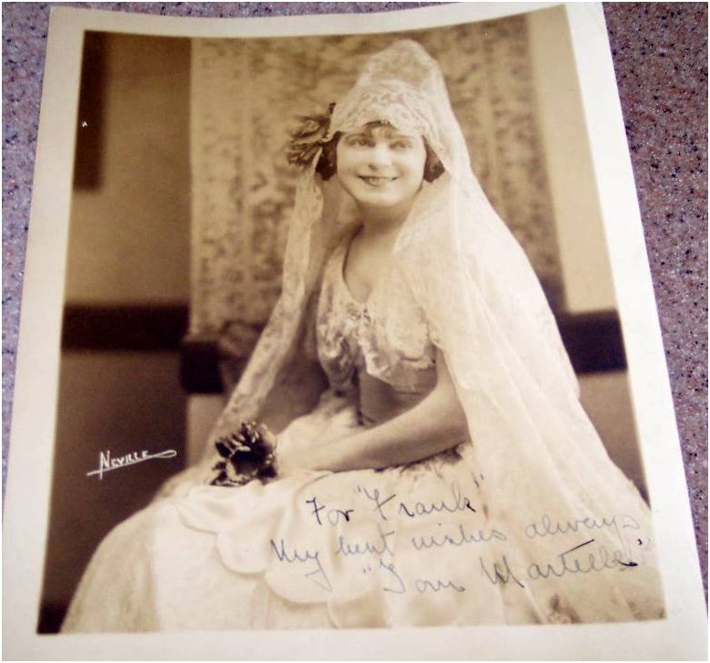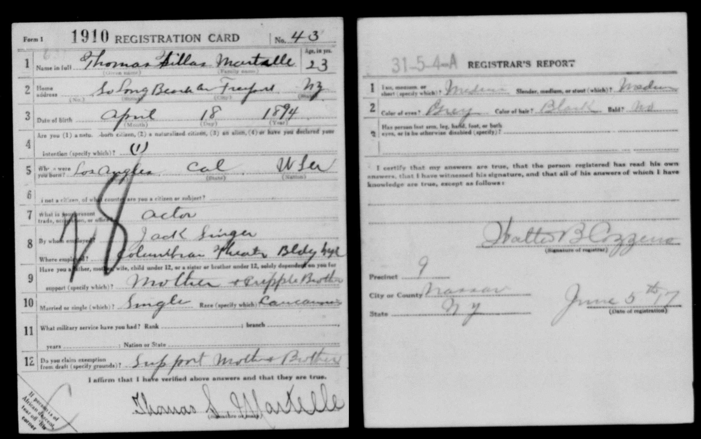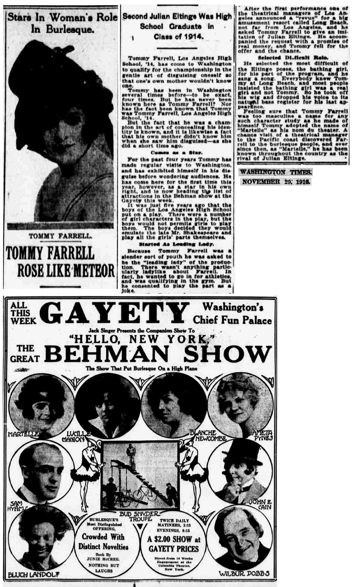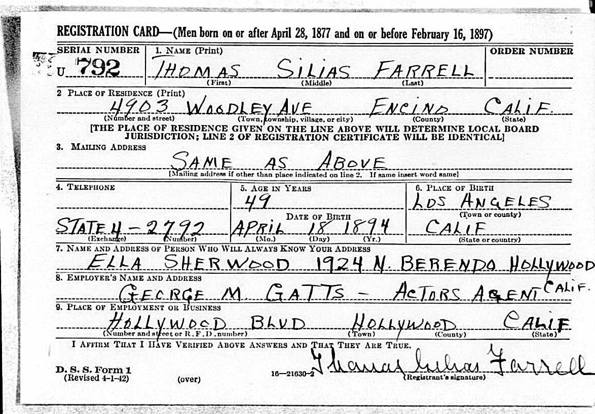 to send me some research he did on Martelle. There is an article from the Washington Times (11-29-1916) with the headline "Tommy Farrell Rose Like Meteor." The article mentions that he graduated from Los Angeles High School in 1914 and that "feeling sure that Tommy Farrell was too masculine a name for any such character study as he made of himself Tommy adopted the name of 'Martelle' as his nom du theater"..."rival of Julian Eltinge". There are two draft records for him: WWI and WWII. In WWI, he identified as Thomas Sillas Martelle, for WWII, Thomas Silias Farrell. Same birthday (4-18-1894) and handwriting...no doubt the same person...also born in Los Angeles. The WWII draft card asks for a person that will "always know your address"--he lists Ella Sherwood, 1924 N. Berendo, Hollywood, California. In 1940, he is listed as living with his wife Anna on Camarillo Street, LA. Occupation: actor. This is presumably his sister for in the 1930 census he resides with Charles and Ella Sherwood on N. Berend street along with his wife, Anna. His relationship to the head of household is listed as brother-in-law. Occupation listed as: actor...legitimate stage. The California Death Index lists a Thomas Silas Farrell, born 4-18-1893, died 8-23-1956 in Los Angeles. The birth date is one year off, but I am certain this is him based on other genealogical data and the low likelihood that it would not be based on all of the other context. I have not gone too much further into it, but it looks like he was the son of Joseph Samuel Farrell and Mary Donahue who came from Canada to Los Angeles.