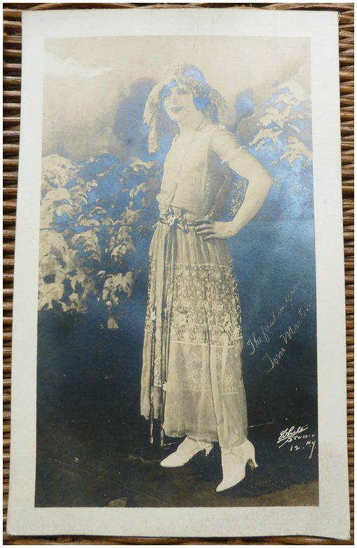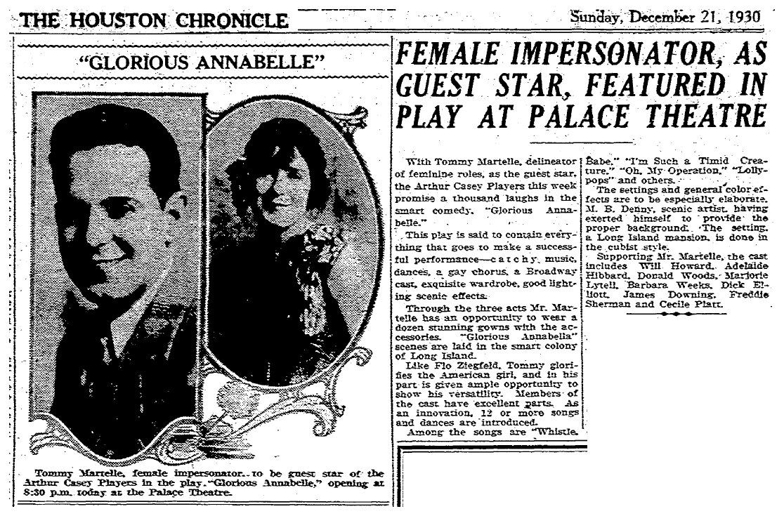 Okay, can you name a female impersonator who had an ice cream flavor named after him? Nope, not RuPaulicious, not Divine Pink Flamingo...I'm not talking Ben & Jerry's commemorative names. You have to go back, way back for the one I have in mind. And it happened in 1926. The flavor was called "Hanford's Tommy Martelle Special." Hanford was the ice cream company, and it was sold in bricks. Tommy supposedly concocted the recipe himself, incorporating pecans, pineapple, coconut, black walnuts and maraschino cherries. What? Tommy who? Tommy Martelle (sometimes spelled Martell in the early years) was one of the most successful female impersonators of the 1920's. His career began at least as early as 1911, when he was billed as "The Boy With the Pretty Gowns." It continued to build by the end of the teens, when he was in a production of Julian Eltinge's famous musical "The Fascinating Widow." Now, Eltinge was definitely THE most famous, and successful, female impersonator of the teens and 20's, and he became very wealthy with his shows. Eltinge even had the honor of having a New York theatre named after him. But this is about Tommy, and I've found essentially nothing about his personal life, when he was born or died...just clipping after clipping of his show successes, all through the 1920's across the country. In 1923 his career skyrocketed with his musical, "The Gay Young Bride," and later with other shows named "The Fashion Girl," "Some Girls," and "Glorious Annabelle." One clue I got to his popularity is that he was among the very few whose image was used in the venue ads of the time. The most common billing given him was that he was "The Foremost Delineator of Feminine Types." He was especially known for his dazzling costumes, and one headline read "Tommy Martelle and Wardrobe Are Back." So, what happened to him after the 1920's? I'd love to know, but perhaps his career faltered in the 1930's when female impersonation had begun to lose popularity, and performing became difficult due to the laws in some locations forbidding cross-dressing. (April