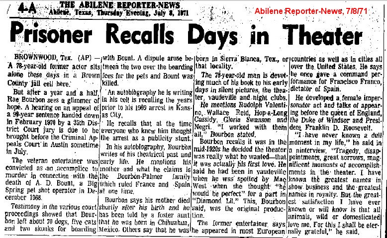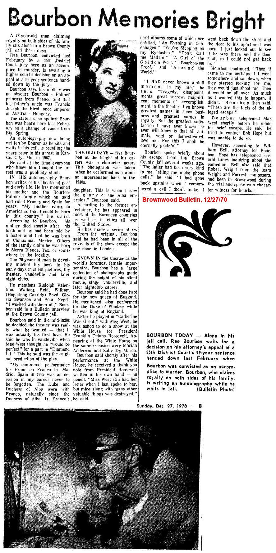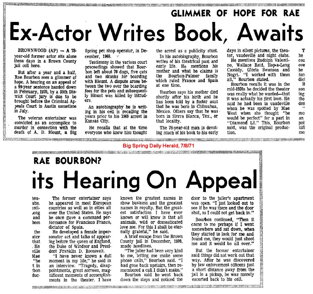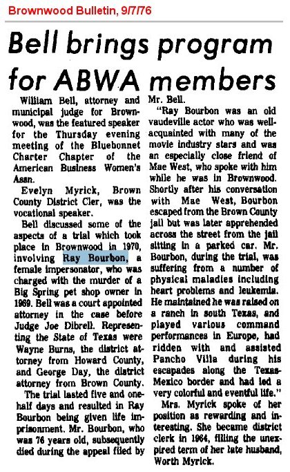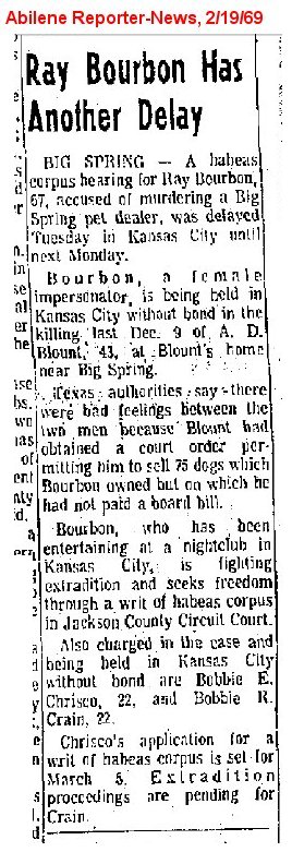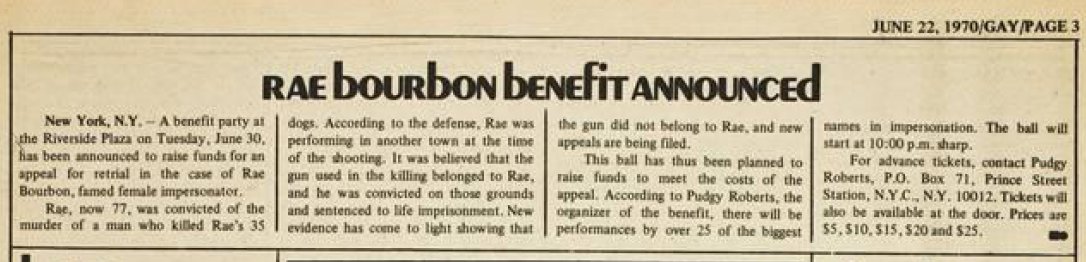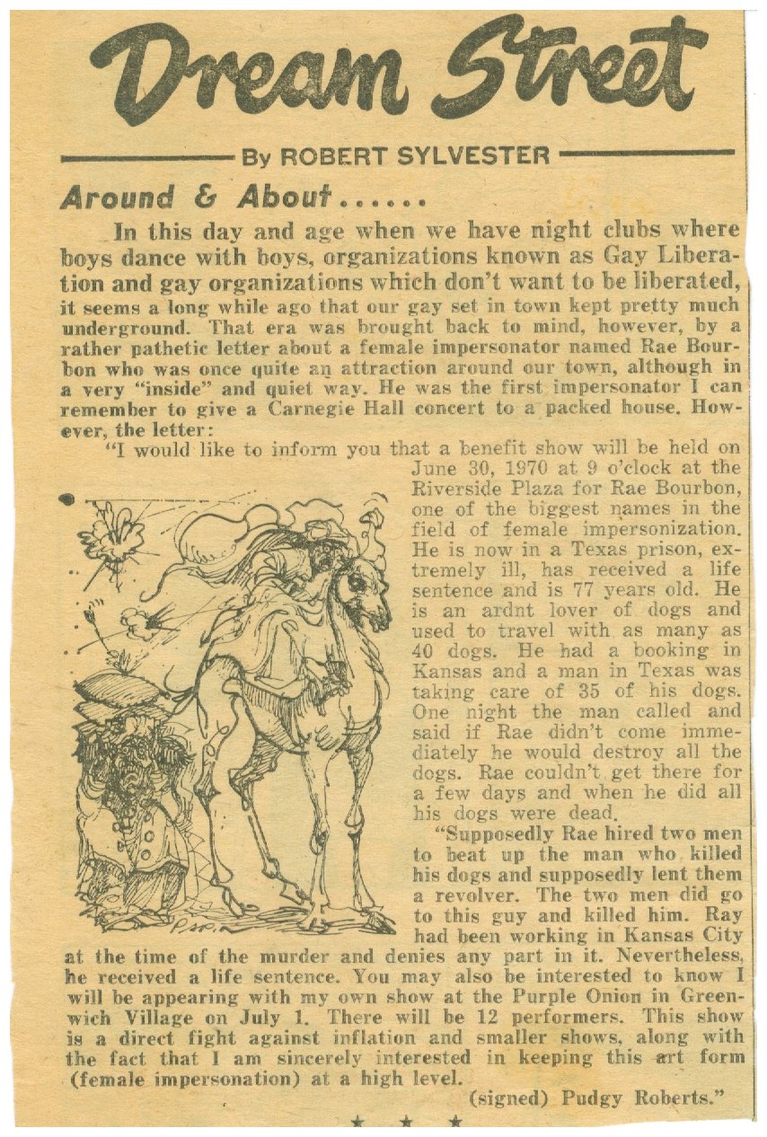 back to Drag Artist Discography entry page News Articles on Ray Bourbon also see Albums 78's Photos Flyers & Misc News Clippings From Mainstream Press: The Trial: 1969
