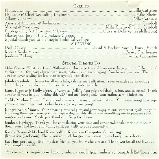 mygayweb.com Definitely the Gal about "town" here, she's a singer, songwriter, pianist, performer, actor and an MC who's been delighting audiences for years! "Whenever Drag is mentioned in the Twin Cities, the one name that immediately pops into the conversation is "DELLA CATESSEN! ". Definitely the Gal about "town" here, she's a singer, songwriter, pianist, performer, actor and an MC who's been delighting audiences for years! This self-professed "late bloomer" swears that she started doing drag professionally a few years ago, as the result of a friends dare. Now, beauty queen hopefuls tremble at the mention of her name." I have never taken any offense to being called a "drag queen" (depending on if it is said in a mean way or not), but it all depends on how you emphasize the words. For some people "drag queen" conjures up some negative images. On the other hand, there are those who feel that "Drag Illusionist" or "Female Impersonator" sounds a little hoity-toity, as if somehow elevating themselves above the rest of the crop. There are a lot of different "levels of drag", from casual "street drag", to the professional performers (Illusionists, female impersonator, etc.) that make a legitimate living at it. Using some of those fancier terms does add more legitimacy to what a performer does and thereby making it more appropriate to use. Hmmm, that's always been a bit of quandary for many of us. It is surprising how touchy some people can get about this topic. I guess that it really depends (like so many labels), on who is saying it and in what context. For myself, I am glad if they call me at all! I guess I just like to be referred to simply as a "performer", or "impersonator", because that really is what I am and what I do. However, I suppose that "Professional Glamour Puss" would also be appropriate! I think that this was something I was born with...like being gay. I never tire of of the audience and they give me so much more than I could ever possibly hope to give back. One of my early distinct childhood memories was as a toddler. I was a very shy and rather lonely child. Mom was a beautiful and charming woman, with definite glamour all her own. I would sometimes lie on the sofa with my head in my Mom's lap and watch her read. She would also read the old "Photoplay" magazines aloud to me sometimes. I would see pictures of the glamorous female movie stars and ask all kinds of questions about their lives. I was mesmerized, as she would relate to me the stories and trivia about these glamorous icons. She loved it too. Often we would chat for hours about Hollywood and movies, and music. She had a beautiful voice too, like a young Rosemary Clooney, and she would sing popular songs and show tunes to me. Then I would sing them back to her. She would applaud and delight in my antics. I think that Mom was my first real audience, and it helped give me confidence. Little did she realize that she was sowing the seeds that later would take root into the entertainer I am today. Unfortunately, most of my family is gone now. We were a very small family to begin with. My younger (and only) brother died suddenly almost 3 years ago at a young age. I am sorry to say that my father was an alcoholic and physically and emotionally abusive, and my parents finally divorced after being married way too long. My Mom is 80 and has had a couple of strokes and other health problems. But she is very young acting and looking for her age, and she has an amazing attitude about life. The last 2 years she has lived the majority of that time with me, and then gone to her condo in Florida for the winter where she had some other help. She and I are so fortunate to have a very unique and wonderful relationship. We are much alike in many ways, and fortunately we enjoy each other's company as well. I came out to her when I was 20, and there were really no problems. Her biggest issue was that she wanted so much to be a grandmother to my children, which didn't happen. I can relate to her disappointment because I have always wanted to be a parent myself. I believe I would have been a good parent, but I think it might be too late for me now. I am lucky, and proud to have the kind of open and honest relationship Mom and I do. I really believe that I was blessed to get her as a mother. She is a totally accepting person and knows all about Della. In fact, she helped me make my first Pageant gown! When she was living with me last year, I would come upstairs to say goodbye before I would leave for work, and she would give me the once over and critique my look. Sometimes she would say, "Oh, I just love your hair that way", or, "are you sure you really want to wear those earrings with that outfit"! I would just crack up! As for any love relationships, it has been a little while since I was "in" love. I do date when I can, and am open to more. I am very pleased that I have had two wonderful men that I have deeply loved in my life. If it doesn't happen again for me, then I am very grateful for having experienced true love, even once. If it happens again all the better! But one thing I have learned is, you can't make it happen. When it is time, it will come to you. Jeez, I am being awfully philosophical! I was performing vocal solos in an adult choir when I was only eight years old and been performing professionally in nightclubs since I was seventeen, as my alter ego "Chaz". I have sung and played piano in nightclubs and supper clubs right up until I began working as Della almost eight years ago. I also have a very strong theater background, and had performed in lots of shows, including a season in repertory at the world renowned Tyrone Guthrie Theater. I have also written, performed, and produced several local and national radio jingle Ad's. Plus when I was thin, (yes, I really was thin), I did a lot of fashion and catalogue modeling as well as some packaged products that were nationally distributed. So as you see, the performance arts have