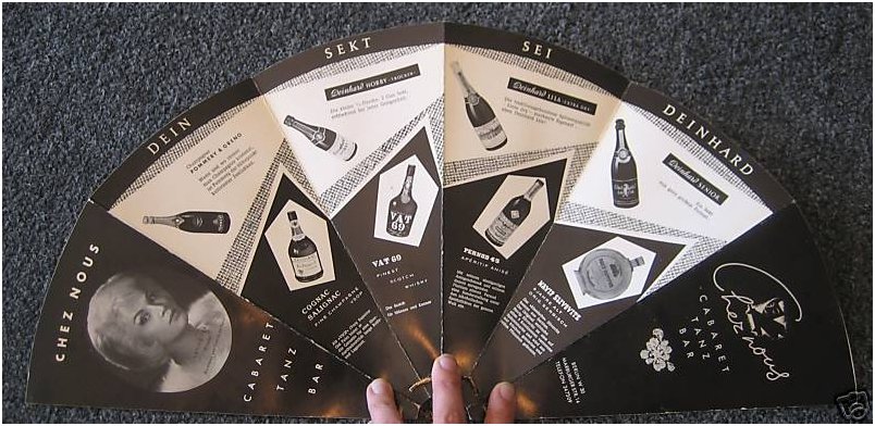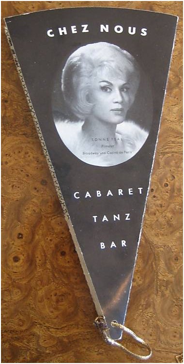 And, a very special item, a fan from the Chez Nous, featuring: Sonne Teal, Pepe Darena, Lana, Brasiliana, Wanda Pierys, Domono, and Everest I'm guessing this prize is from the '60's