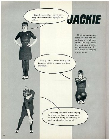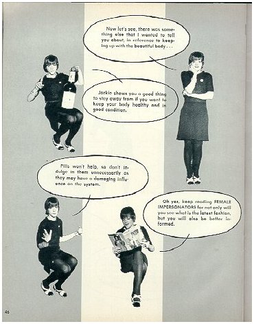 Jackie Curtis pics from "Female Impersonators" magazine, Summer 1969 There's a certain irony in these pics....here Jackie Curtis is covering all the angles for a healthy body, including staying away from alcohol and pills....she didn't heed her own advice though, and died of a heroin overdose 16 years later, in 1985. |