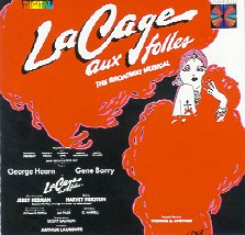 "La Cage Aux Folles." The most famous and most successful gay musical on Broadway recreated the story from the 1979 French film, and won every Tony Award in sight: Best Musical; Director (Arthur Laurents); Book (Harvey Fierstein); Score (Jerry Herman); Actor (George Hearn; Gene Barry was also nominated). Its battle cry, "I Am What I Am" is one of the few songs from a gay musical to go on to a life of its own, being recorded by a number of artists. Soundtrack: RCA 14824, 1984. Click for more. |