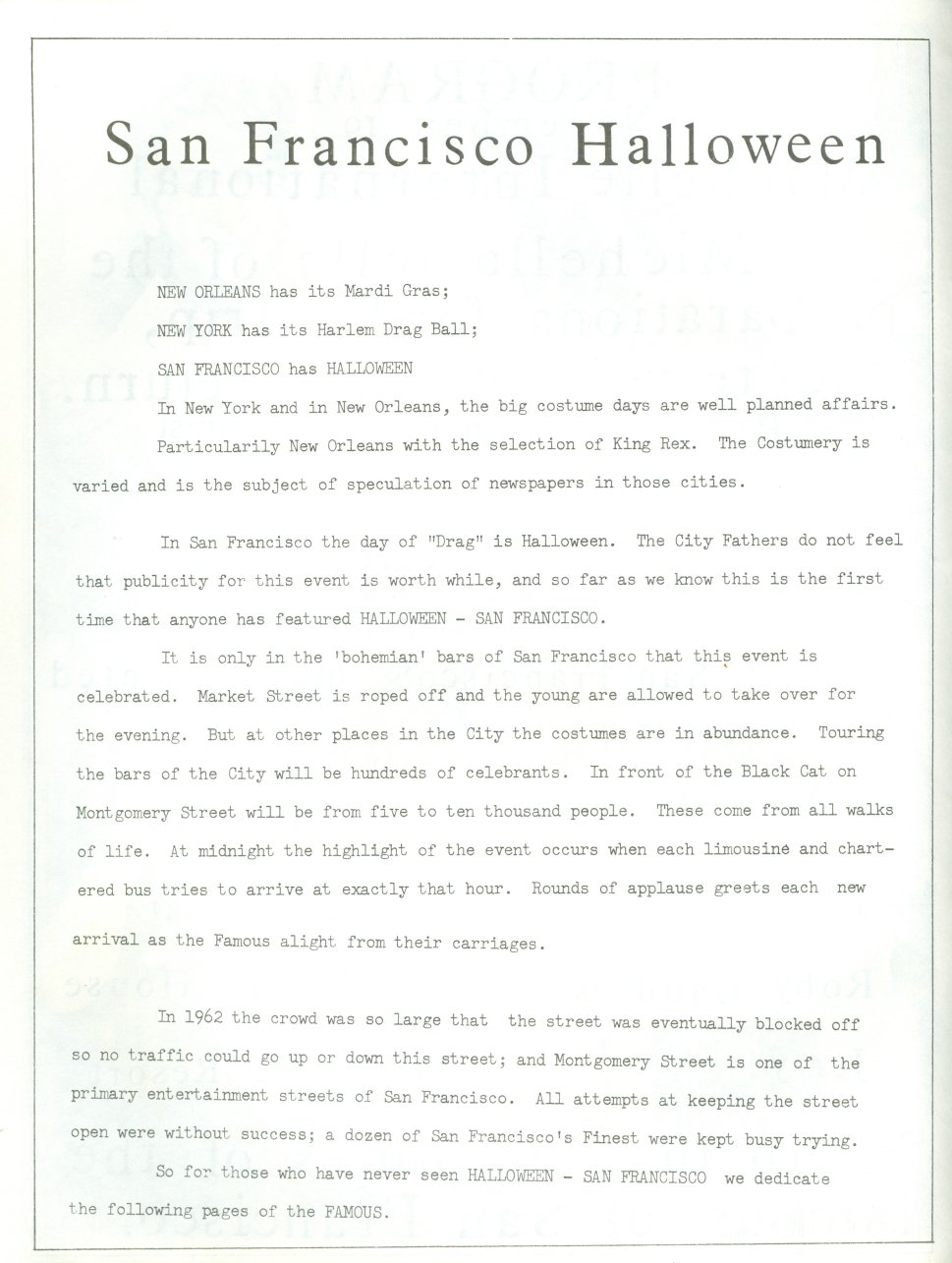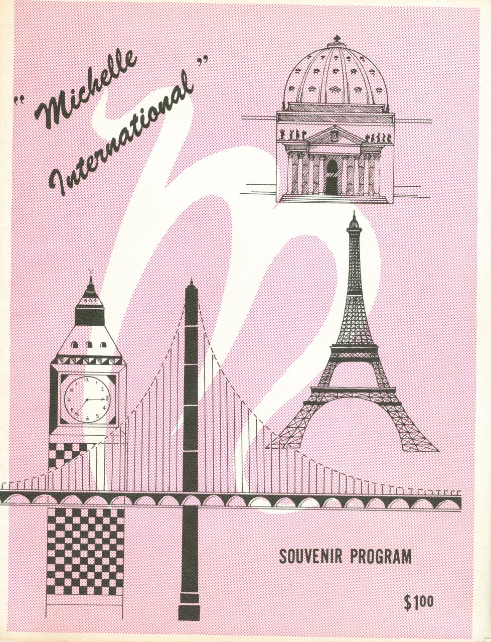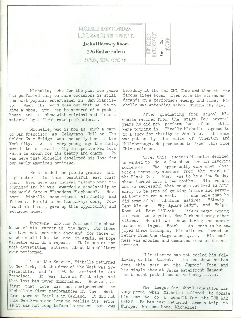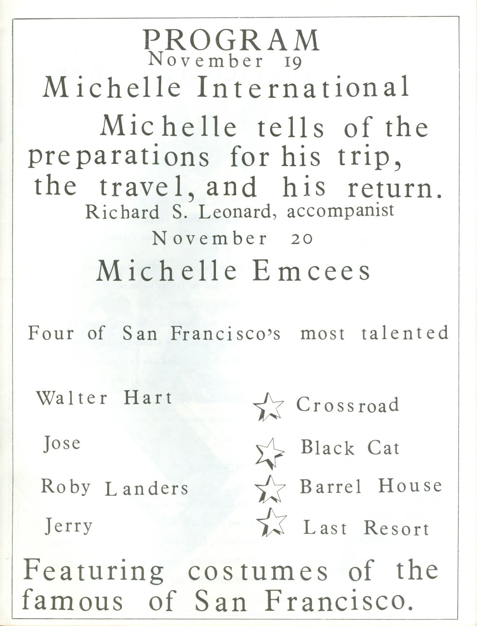to main Drag Intro Page "Michelle International" Souvenir Program, November 1962 This event was sponsored by the League for Civil Education, one of the earliest organizations formed in San Francisco to stand for gay rights, in particular, to combat the raids on the bars. Note the introduction makes no mention of gay or homosexual at all, such was the nature of the times. Jose Sarria was very active in LCE and led efforts to solidify gay block voting...in a run for Board of Supervisors he got 5600 votes; years before Harvey Milk ran for the office.