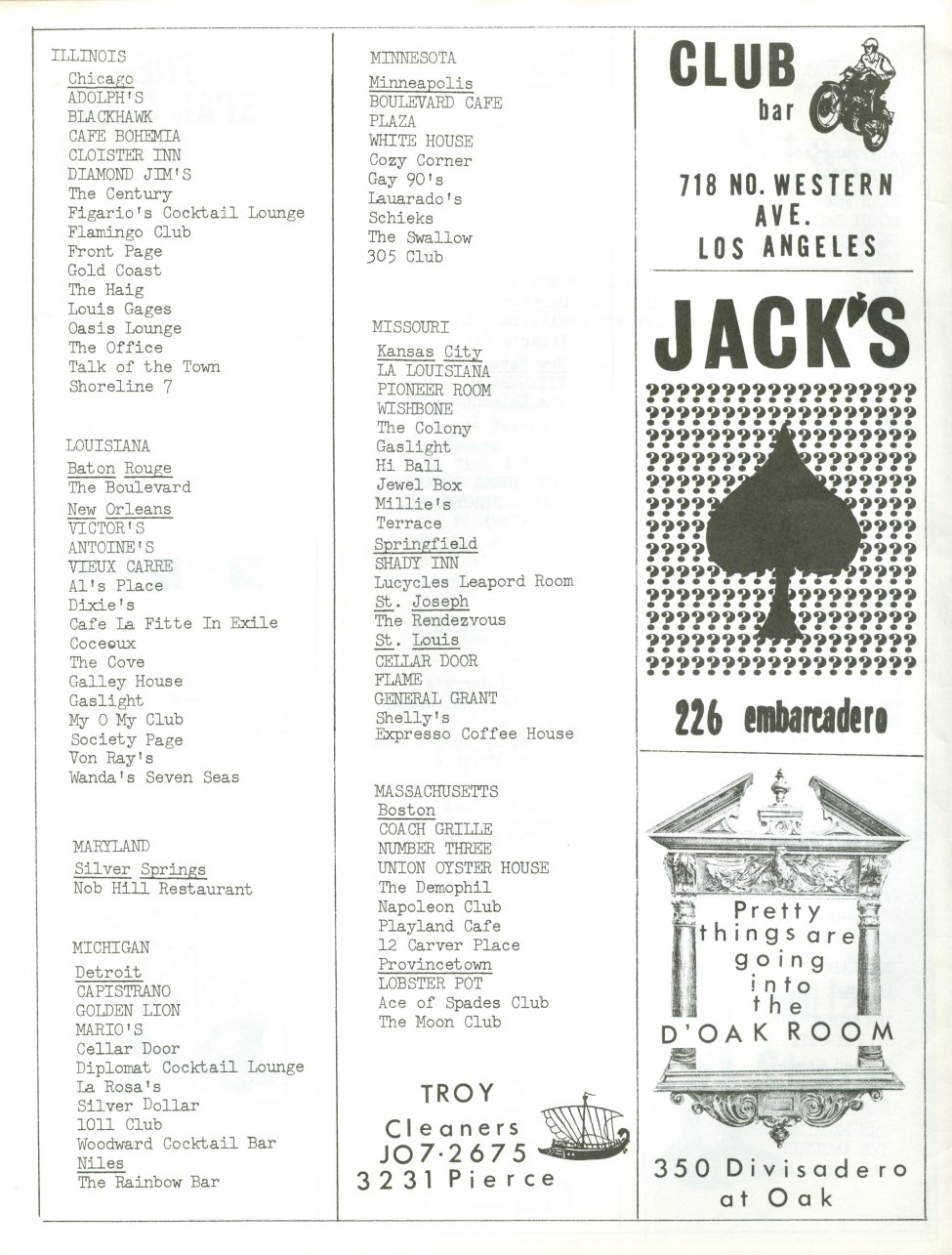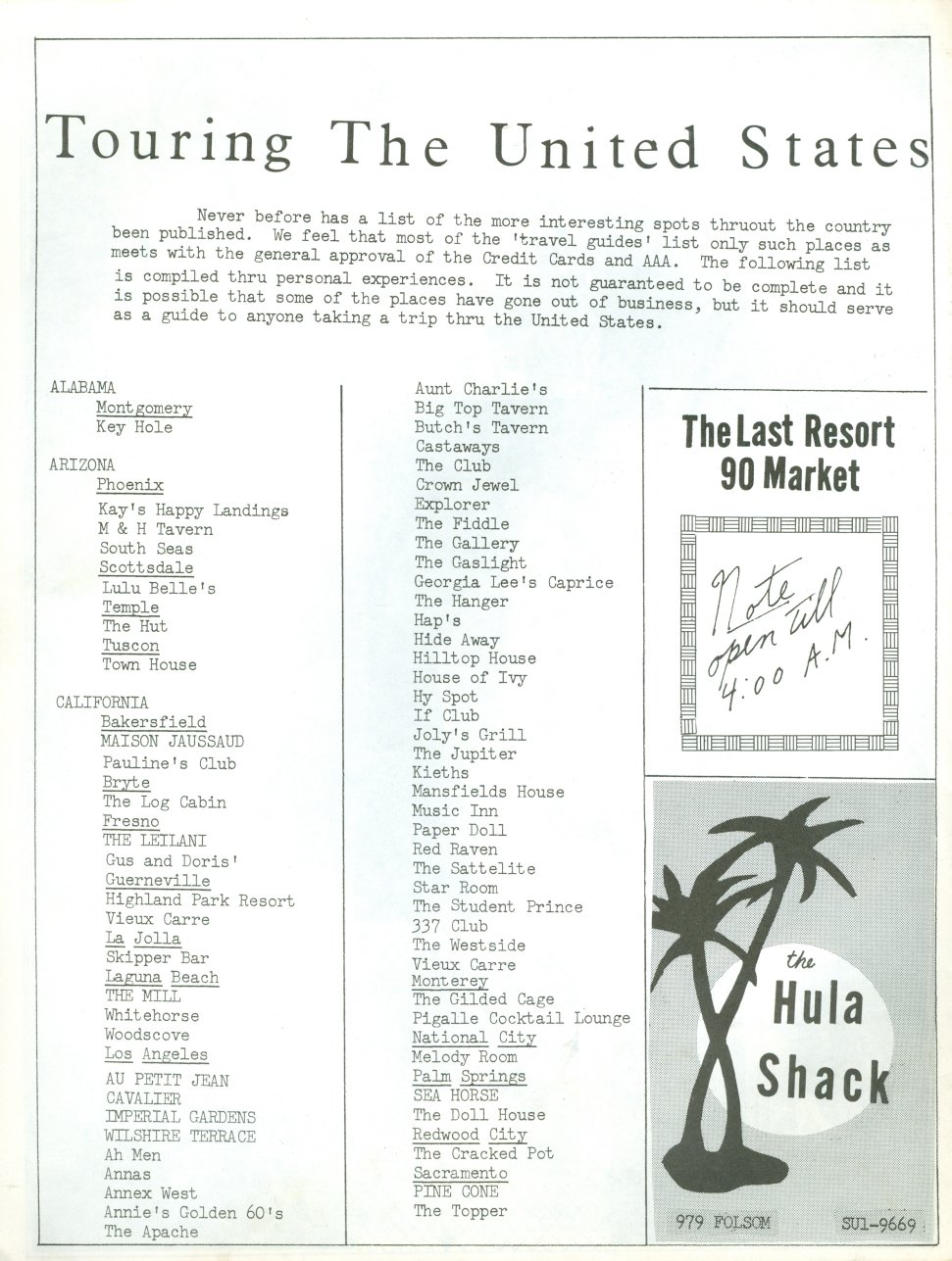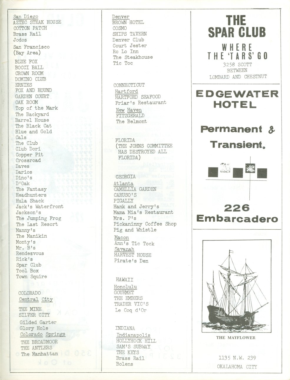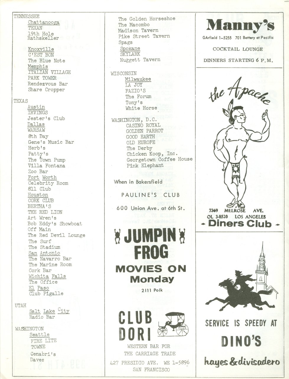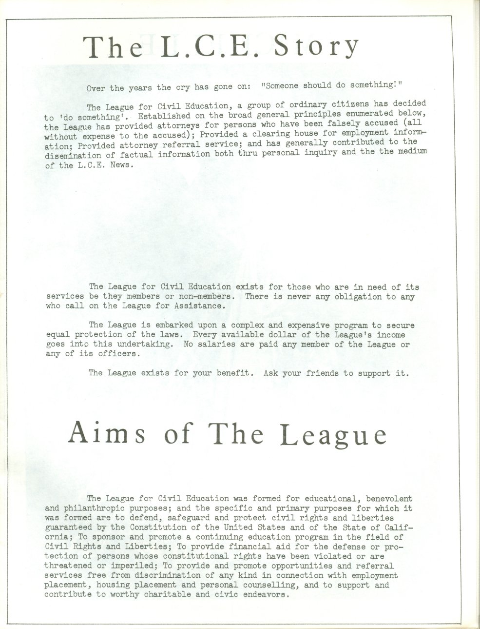 to main Drag Intro Page "Michelle International" Souvenir Program, November 1962 This event was sponsored by the League for Civil Education, one of the earliest organizations formed in San Francisco to stand for gay rights, in particular, to combat the raids on the bars. Note the introduction makes no mention of gay or homosexual at all, such was the nature of the times. Jose Sarria was very active in LCE and led efforts to solidify gay block voting...in a run for Board of Supervisors he got 5600 votes; years before Harvey Milk ran for the office.