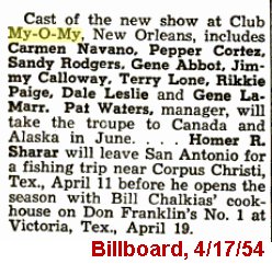 Jimmy Callaway, Poppy Lane, Sandy Rogers, Carmen Novarro, Gene Abbott, Dale Leslie, Pepper Cortez, Rikki Paige, Gene La Marr [ note different spellings on Carmen Navarro and Rickey Paige ]