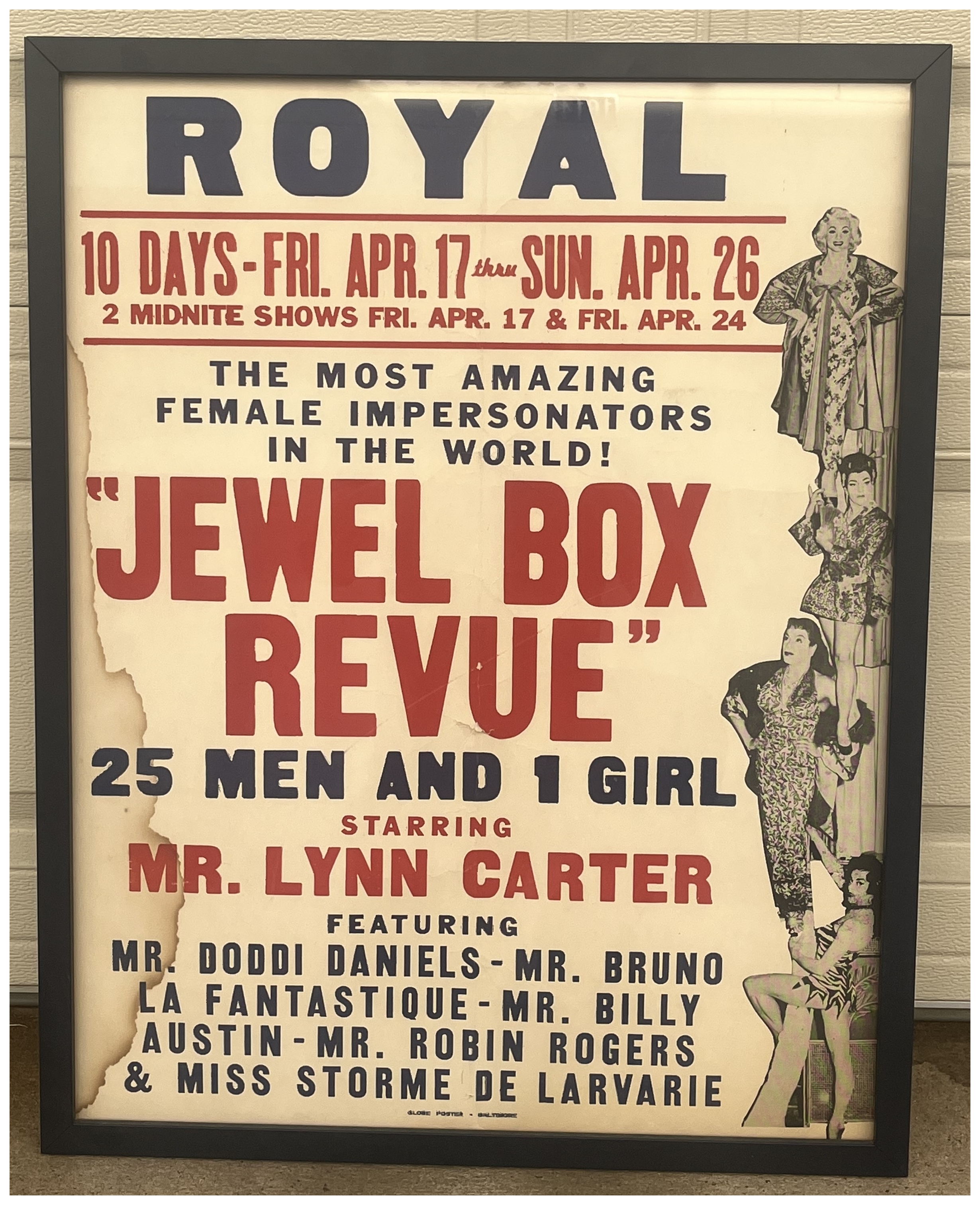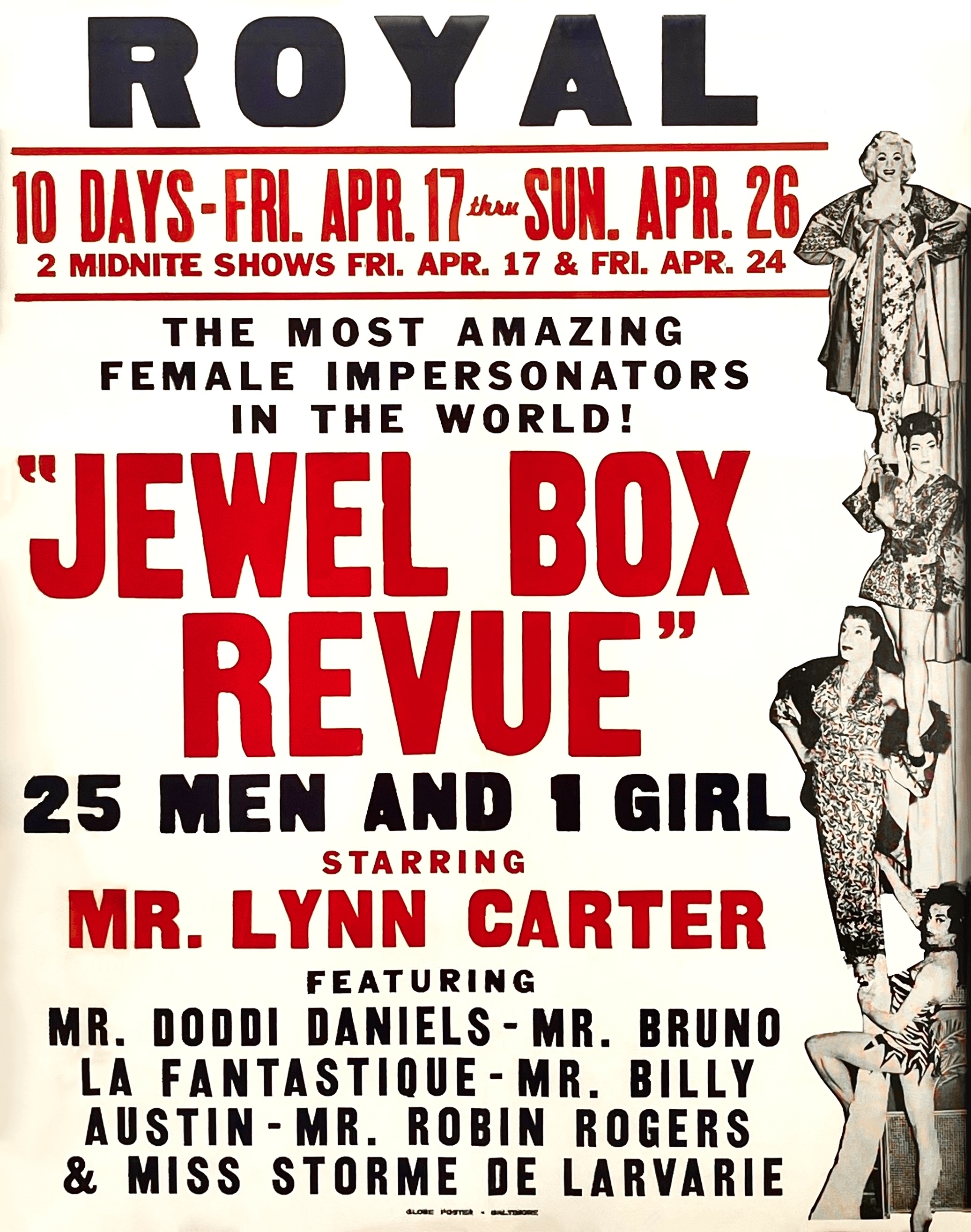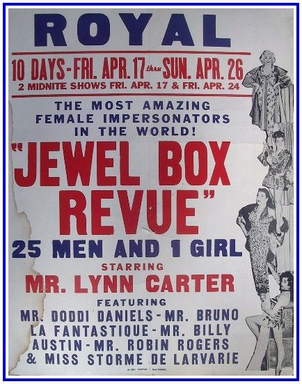 in the shows in this period, with these names most common: I found verification (not in the scrapbooks, but on the net) that Danny & Doc ran clubs called The Jewel Box in two Miami Hotels. The starting point is speculative for the first one. The Embassy Hotel in Miami (Collins Ave & 30th St) opened their "Jewel Box cocktail lounge" in December of 1936. It got good reviews in the newspaper and featured the Bob Rainier Trio as entertainment at least through the end of 1939. The first mention that Danny & Doc were involved with this club was in a May 1940 clipping. As in the later Tampa and Miami clubs, no female impersonation entertainment was mentioned at all. Between August and December of 1941 the club moved from the Embassy Hotel to the Fleetwood Hotel (West Ave). Sometime between April and August 1942 they had moved to Tampa. The Jewel Box Club in Tampa was open at least by the Fall of 1942, and was billed from the start as "Danny & Don's Jewel Box Club." I place the end of that club at early 1949 due to an article from that time mentioning Danny as "former owner of a club in Tampa." As there were licensing and zoning lawsuits surrounding the Miami club, at least at the 512 NE 15th St address, articles limit that operation from 1946 to late 1950, when Danny lost a zoning lawsuit to continue in that location. I found no reference to another club address in Miami (or anywhere) after that. One further history discrepancy I found is the "official" time span that their touring company used the name Jewel Box Revue. Their programs all say "The first Jewel Box Revue was co-produced in 1939 by Danny Brown and Doc Benner." I think this was written more as a public relations/show business generalization...and I understand that reasoning. It would be much harder to explain that that they had a number of touring companies with a variety of names from 1939 through the end of the 1940's. The Jewel Box Club, in Tampa, did not open until the Fall of 1942, and both in the scrapbooks and my internet research of old newspaper ads, I found no ads that use the actual name "Jewel Box Revue" prior to 1950. So, it's odd, the clubs operated from 1942 through 1950, but no ads referring to the Jewel Box Revue until mid-1950. I would be delighted if someone can provide me an ad to prove this research wrong. I've got this 22x28 poster framed, from a Baltimore engagement, 1959
