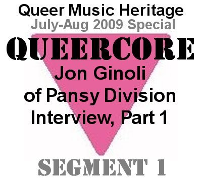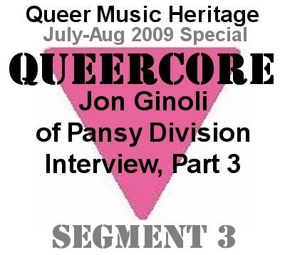 What is the most popular Pansy Division song? JG: "Bunnies," followed by "Luv Luv Luv." After that "Bunnies," "Luv Luv Luv," "Femme in a Black Leather Jacket." And are you basing this answer on sales, audience response? JG: Audience response. That's what people yell for, and that's what people request, like if I run into somebody before a show, they'll say "are you guys going to play 'Bunnies' tonight." That's often what people will say. Pansy Division - Bunnies (1993) Welcome to the July 2009 edition of Queer Music Heritage, and that song sets the tone and gives a very energetic start to Part 2 of my Jon Ginoli interview. This is where we're going to talk about a whole lot of Pansy Division songs that I just can't play on broadcast radio, obviously like "Bunnies," taken from their 1993 album "Undressed." How has the subject matter of your songs evolved over the years? JG: Well, let's look at those songs I just mentioned. "Bunnies" and "Femme in a Black Leather Jacket" were songs about desire, about a guy desiring another guy. "Femme" is about a guy, you know, somebody's he's attracted to. "Bunnies" is about getting it on. The other song in that trio is "Luv Luv Luv" which came five or six years later, and "Luv Luv Luv" is much more cynical, and kind of worldly. It's like, here's how the world works. The idea that we grow up with pop songs from the music we hear as kids we get ideas about what love is going to be like, what life is going to be like. What is it like to be in love, and I think that because pop music is made to sell you songs, it's a distorted picture, so you get to a certain point where you realize all these ideas you had about what love is going to be like are pretty inaccurate. In the beginning of the band we were trying to be more celebratory, because that's what we felt hadn't been done celebratory songs about gay sex, about gay love and by the time we got around to "Absurd Pop Song Romance," five years later, I felt like it was time to show the other side of the coin. Instead of always getting the guy, or feeling like the guy is attainable, we turned and showed some disappointment. And that was I think "Luv Luv Luv" a good distillation of trying to evolve but at the same time doing something that people could still recognize as Pansy Division. Okay, you want evolving? Here's that same song, "Luv Luv Luv," done very differently. Common Thread Community Chorus - Luv Luv Luv (2009) Now that was something I would not have expected, and it was just uploaded to youtube from a May 30th performance by the Common Thread Community Chorus of Toronto. Further irony is that it was recorded at a performance at the Holy Trinity Church. Yup, plenty of contrast on this show, as you'll continue to see. On this segment we're going to cover four songs from the "Undressed" album. We started with "Bunnies" and next is "Cocksucker Club" JG: I had a friend in San Francisco, he's still a friend of mine actually. We were talking about a guy who we thought was gay and I wasn't sure, and I said, is he? And my friend said, "well, he's in the club." And I thought, well what club would that be? And then I immediately thought, well, the cocksucker club. You know, are you gay? Well, if you're sucking dick, you're gay, or you're bi, or whatever. And the song says, he might be bi, he might be gay, that's one of the lines. So I thought, that's where the that's the club we're in. [it's where the rubber meets the road] Yes, so to speak. Pansy Division - Cocksucker Club (1993) Tell me about "Anthem" JG: The chorus of "Anthem" was actually the first thing that I wrote for Pansy Division. It's an anthem, of course, given the title the lyrics, "we're here to tell you, you better make way, we're queer rockers in your face today." That's what my initial impulse was to do with the band, and you know, to sort of draw the line in the sand "we can't relate to Judy Garland, it's a new generation of music calling" to say, this is different than what queer culture normally is. Pansy Division - Anthem (1993) "Rock & Roll Queer Bar" JG: I had been a DJ at a club of the same name in San Francisco, along with Don Baird, who's been a columnist for the queer biweekly magazine in San Francisco called "San Francisco Bay Times" for almost 20 years, I think. He and I started a club together because we wanted to have a queer rock club. And it happened right as I was starting to record Pansy Division's stuff in '91. So when I went to do the first recording session for Pansy Division, I recorded that song thinking "ah, it'll be the theme for my club and then I can blow people's minds with, by playing that at my club. But the club only lasted a couple more months after that, because the club we were doing it in shut down, and then I got busy with the band. And this time I'm going to share another early version of the song, from Jon's 1991 cassette tape, "Undressed," here's "Rock & Roll Queer Bar." Pansy Division - Rock & Roll Queer Bar (1991) When Pansy Division formed what other openly queer bands were there? JG: Well, when we formed, when I had the idea to do Pansy Division I knew of no one. As it turned out the one band that was together the records were impossible to find at that point, was Fifth Column, from Toronto. They were the only band that were all gay, and singing about gay stuff before. So they were like a year before us, maybe a year and a half, couple years [note: Fifth Column's first recording 45 was actually in 1985 and LP in 1986, but would have been as Jon said, very difficult to know about or find]. I forget when their first album came out. It was pre-CD, it just came out on vinyl, and has never been on CD. They were very obscure and I only knew about them because of "Homocore" magazine, and "JD's," Bruce LaBruce's old fanzine, "Juvenile Delinquents," that he did with GB Jones from Fifth Column. Apart from that, like I say in the intro to my book, there were, you know, there were gay musicians who were around be