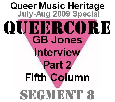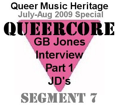 This is JD Doyle and you're listening to Queer Music Heritage. Welcome to the JD's Homocore segment of my Queercore show. I want you to listen carefully to especially the last verse of this song. There will be a quiz. Nikki Parasite - Male Call (1985) Yes, that group wanted to be on the JD's Top Twenty Tape. That was Nikki Parasite, from 1985 and the song "Male Call." And male was spelled m-a-l-e. On this segment you will hear every song from the famous JD's Top Ten Homocore Hit Parade Tape, plus many more. And I'm delighted to also give you an interview with GB Jones, who with Bruce LaBruce created the JD's fanzine in Toronto in the mid-80s. GB will tell us about the zine and we'll also get deep into the story of her band Fifth Column. And besides being a musician and zine publisher, she's also an artist and filmmaker. Her film "Lollipop Generation" is currently making the rounds of film festivals. I wanted to get your impression of what is Queercore music? GB: Oh, that's a good question but it's so hard to answer. It's definitely different things to different people, because all the different bands that were involved, and are still involved, all had very different styles of music, and I think that's what's really exciting about it, is that there wasn't one particular set type of music that a group had to be in order to feel like they were part of it, like for instance, Pansy Division, who I know you're also talking to, are like a pop-punk group, and if you look at a group like, say, God Is My Co-Pilot, they were extremely experimental, kind of free-form punk, I guess you'd I had to label groups cause they always insist that you've labeled them the wrong way afterwards, but I'd say Limp Wrist are like a hardcore group, and a group like Three Dollar Bill, from Chicago, has a you can hear punk, and indy rock and a little bit of metal in their sound, and then there's the newer groups like Kids On TV and Lesbians on Ecstasy, and they've got a, they're using electronic music and synthesizers. There's such a wide range of music involved. I think that's what's really exciting about it, it's not like you can talk about Queercore, but you're not talking about a specific genre of music. I've been doing a lot of study and I've read a lot about JD's, the magazine, and the tapes. There's a lot of opinions out there, and a couple things I've read is that JD's seen to be sort of a catalyst that pushed the queercore scene into existence and that one person said that it created a fiction that there was already a homocore movement and people started believing it and it self-fulfilled that prophesy. GB: Right, I would say that's kind of true. So this was started in the magazine, JD's, so could you tell me about how JD's started. GB: Fifth Column had done a song, "The Fairview Mall Story," for the album "To Sir With Hate," and the guest star on the song was Bruce LaBruce. We were writing about a sting operation in St. Catherine's, in Ontario, in Canada. Let's hear the song "Fairview Mall Story," from Fifth Column's "To Sir With Hate" album. Fifth Column - Fairview Mall Story (1985) GB: I started thinking about different groups who had done songs about queer subjects or gay or lesbian subjects and I was also listening to a lot of hardcore bands at that time that did have songs that had something to do with that, whether they were pro or con, I didn't really care, I just thought it was interesting that they'd have that subject matter in the songs, since we had just done this song ourselves, the band Fifth Column. I just started finding all these songs, there were so many of them. There were groups like The Nip Drivers and the Angry Samoans and The Dicks, oh, I can't think of all the different groups. There were quite a few of them. I thought, wow, this is so funny, I put together a little cassette tape for friends, of all these different songs that all had queer lyrics in them. And I thought, wow, it'd be such good idea like I kind of called the tape Homocore, and I thought, oh, it'd be such a good idea to have a fanzine, just based on all these songs and the idea that all these punk kids were doing queer songs and. So I asked Bruce, do you want to do a zine? And he said, yeah, sure, so we quickly put together our first issue and got it out. So your mix tape inspired the magazine? Wow. GB: Yeah, and just reading the lyrics of all these different groups and writing interviews with them a lot of them were talking about gay stuff in interviews, and for instance, a group like Nervous Gender from San Francisco, they were very public about having queer members in the group, from the very early days of punk, like, they were one of the very first synth punk bands, they had lyrics about queer stuff, and of course Phranc was in the group originally, that was like her first group, and the other members were also queer and they talked about that in interviews, notably in research magazines. And this was in the late 70s, so that all came into play too. And also The Dicks' lead singer Gary Floyd, he wrote a lot of queer lyrics in his songs, and he talked about that in interviews as well, he was very public about it. All these things kind of came into play and we put some of the interviews extracts into "J.D.'s." We put a lot of their songs on our Top Ten lists, and that's kind of how it started, just gathering together different things, like songs and interviews and stuff and putting it all together. [and photography and art] and photography and art, yes, that's true, and comics, and anything we could find. The top ten lists fascinate me, cause I'm a queer music fanatic, who put together those lists? GB: Bruce and I did. We just picked whatever songs that we had most recently found that had queer lyrics and we just put them on the Top Ten list, which quickly became a Top Twenty list, and then we tried to update it every time we put an issue out. How many tapes were released? GB: How many of the "JD's Top Ten" tapes? You k