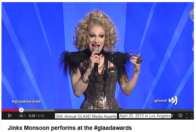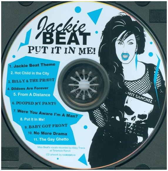 I just love that. The latest, and very deserving, winner of RuPaul's Drag Race was Jinkx Monsoon, and I was so pleased she won, and more pleased to see a video of her singing that last song at the recent GLAAD awards. Of course she took the Broadway classic "Ladies Who Lunch," made famous by Elaine Stritch, and made it about "Ladies in Drag." I want to slip in a comment that I have a large collection of recordings by drag queens, and I found it isn't actually that common for them to sing about being a drag queen. I think the reason is they are playing a personna of a woman and that would somehow cross the line. Not afraid of crossing any lines is Jackie Beat, another very well-known drag artist. She's released several CDs of her twisted parodies of songs we all know. And it's unusual for them to be ones I can actually play on the radio, due to the language, which you may get a hint of by just the title of the CD "Put It In Me," from 2005. But I think you'll enjoy this number, "From a Distance." Jackie Beat - From