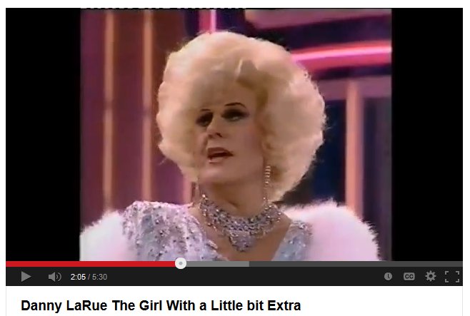 And in that set there were three of the greats of our drag heritage. After Ray Bourbon I played a song by UK female impersonator Lee Sutton. "The Lady Is a Fake" was from his 1968 LP "A Near Miss." And from a video from 1987 Charles Pierce sang "Want to Buy an Illusion" and "One of the Boys." He really didn't sing much, so that was unusual but his comedy was incredible. Danny LaRue was one of the most famous female impersonators in England, and he released a lot of recordings but this next song is from a TV appearance. In it he's "The Girl With a Little Bit Extra." And from there we'll go to a brand new track, which I think is so well done. It's a parody of "Ladies Who Lunch" re-titled "Ladies in Drag." Danny LaRue - The Girl