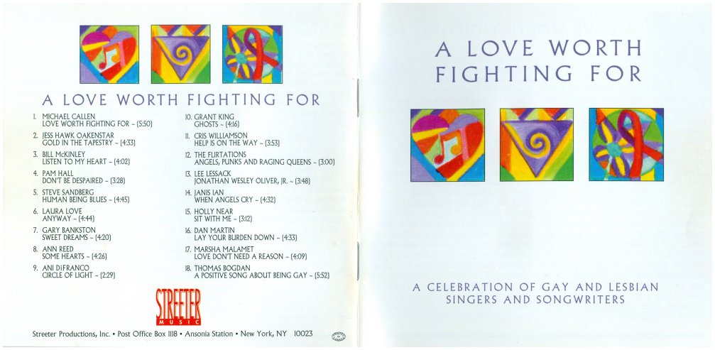 And I played that last one a bit out of order. "Love Worth Fighting For," is another Michael Callen classic. It's from 1995, from the excellent compilation by the same name. So to get back to chronological order on my Anthem playlist are two by women singers who I much respect. Leah Zicari released her queerified version of a very old song in 1990, and it was called "Glory Glory." Leah Zicari
