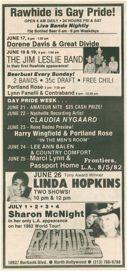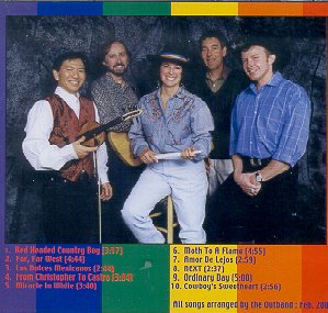 - The Men's Room (1981) And after Harry Wingfield was the title track from a cassette recording issued in 1983 by an artist called, at least on the tape, Romulus. Besides the song "Love Is Just An Inch Away" the tape included graphic songs in a variety of styles, with country being the style most used. Last summer I did a special internet-only show, called "I'll Be FCC-ing You," and if you listen to that show you can hear in entirety several of the almost x-rated gay country songs that I can't include on this show. k d lang came out of the closet in 1992, after years of trying for acceptance in the country market. Those years produced four acclaimed albums, and her first, from 1984, was called "A Truly Western Experience." On that album she did a cover version of a 50s rockabilly hit by Ronnie Self. It's called "Bopalena," and she kept those pronouns intact. k d lang - Bopalena (1984) Okay, you're right, I can't let that be the only song to represent her on this show. From the gorgeous "Shadowland" album from 1988, here's a bit of "I'm Down to My Last Cigarette." k d lang - I'm Down to My Last Cigarette (1988) In 1986 one of my favorite queer acts, Romanovsky & Phillips, added a very country song to their album called "Trouble In Paradise." It's the Larry Havluck song "Musta Been Drunk." Romanovsky & Phillips - Musta Been Drunk (1986) Okay, somewhere I've got to fit in Glen Meadmore, and his work again begs the question of just what qualifies as country music. I've got all five of his releases, spanning back to 1987 and I guess I'm comfortable calling his albums country punk. He obviously is not worried about airplay, as his material fits the titles of his releases, the last three being called "Boned," "Hot, Horny and Born Again," and "Cowboy Songs for Little Hustlers." Many of his songs are openly gay and openly graphic. I picked one from his "Squaw Bread" album from 1988, called "I'll Teach You To Steal My Man." It's verses are very repetitive and here's the one I can play on the air. Glen Meadmore - I'll Teach You To Steal My Man (1988) That was Glen Meadmore. And it would be hard to leave out this song by Two Nice Girls. Now, that's the name of their act, and there were four of them. This song was not at all typical of their sound but they had big success with it, and how could you miss with a lesbian song titled "I Spent My Last $10 on Birth Control And Beer." Two Nice Girls - I Spent My Last $10 on Birth Control and Beer (1989) Again, that was by Two Nice Girls, from their self-titled album from 1989. Also from 1989 is a very obscure album by Jane Howard, called "Passage." I only have one song from the album, but it's a very nice openly lesbian country song called "Something About Her" Jane Howard - Something About Her (1989) At this point in the show there were several other acts I considered including, who were active in the late 80s or early 90s, and who were very popular at the women's music festivals, such as Ranch Romance and the Reel World String Band, or I could even play a very country song from the album "Country Blessed," by Cris Williamson and Tret Fure. But those recordings' lyrics were not openly lesbian, and if you've listened to my shows at all you know that I always prefer to give exposure to a lyrically gay or lesbian song. For this next act, well, I really can't tell you much about them. I found their 1994 cassette in a gay bookstore, and there's no photo, but they were from Madison, Wisconsin. They were called the Cowgirl Sweethearts, and their album was "The Cowgirl Collection." It was filled with seven mostly out of the closet songs including this one, called "You All Got Me All Wrong." Cowgirl Sweethearts - You All Got Me All Wrong (1994) That was the Cowgirl Sweethearts.