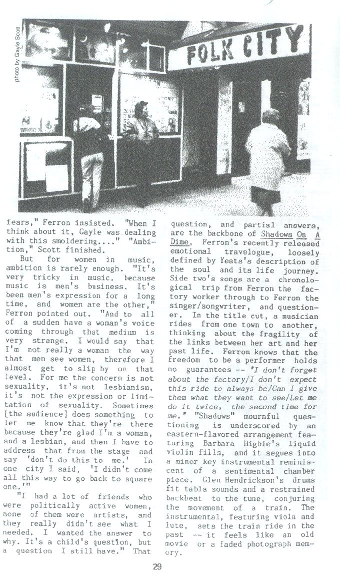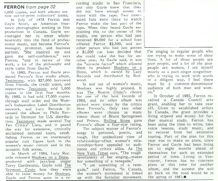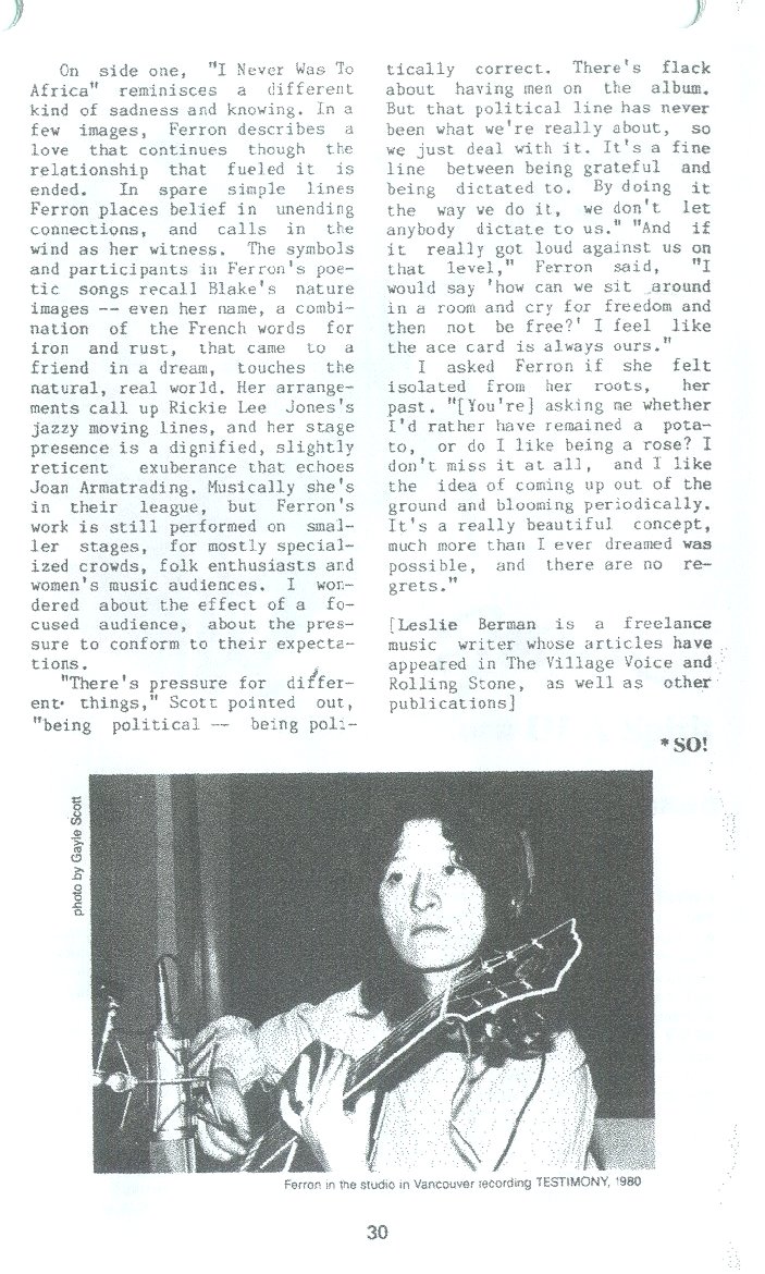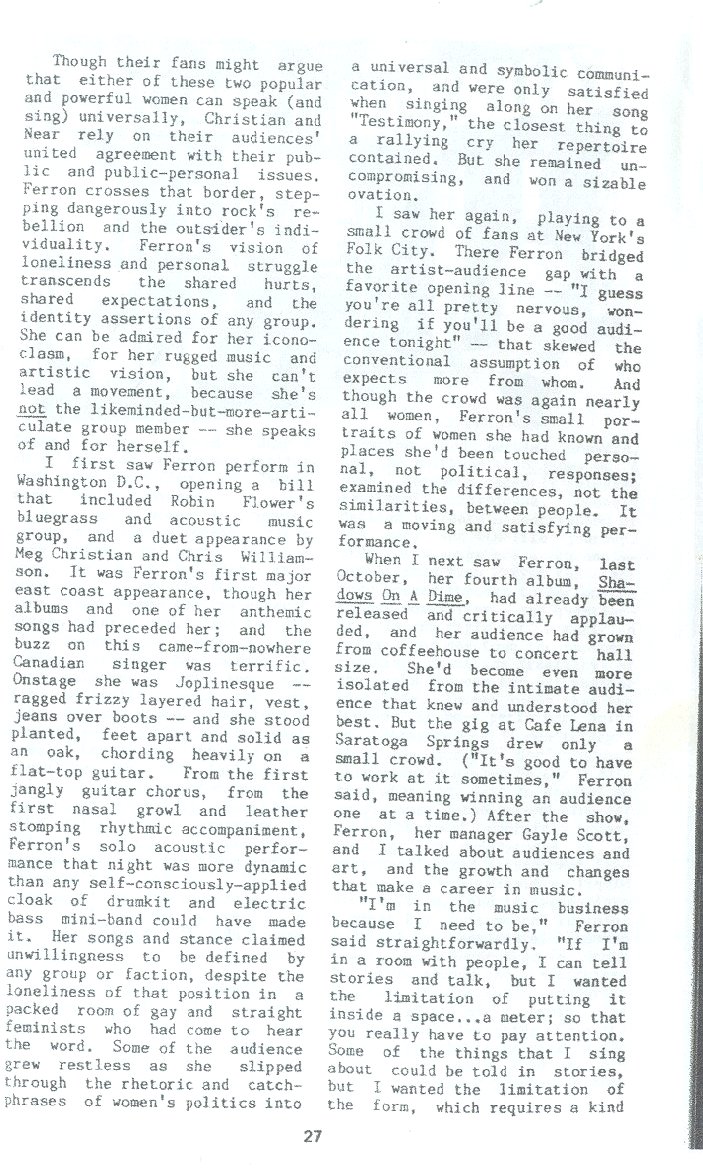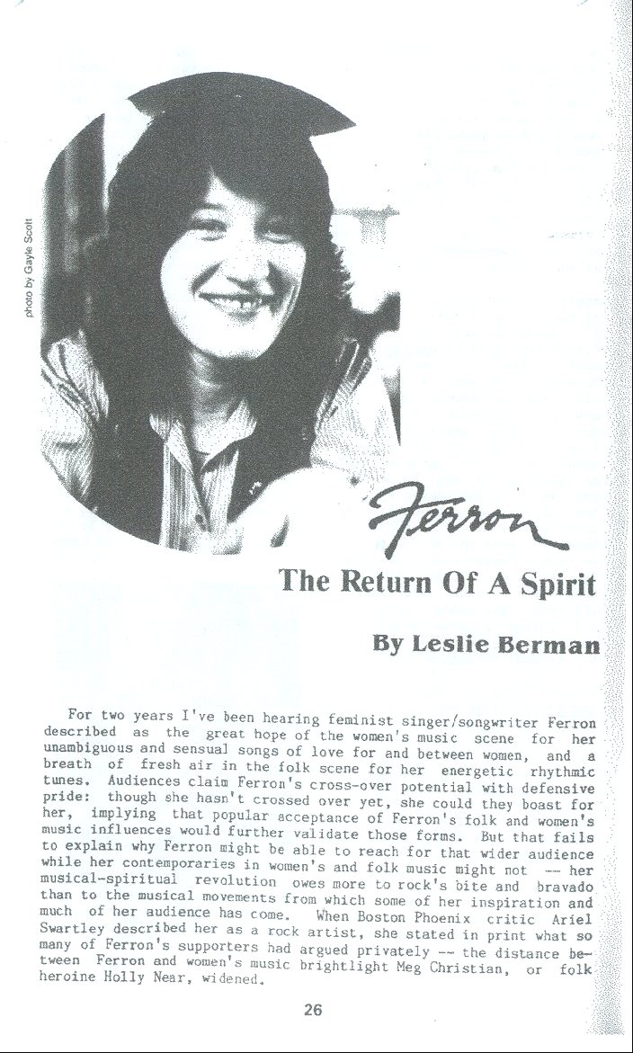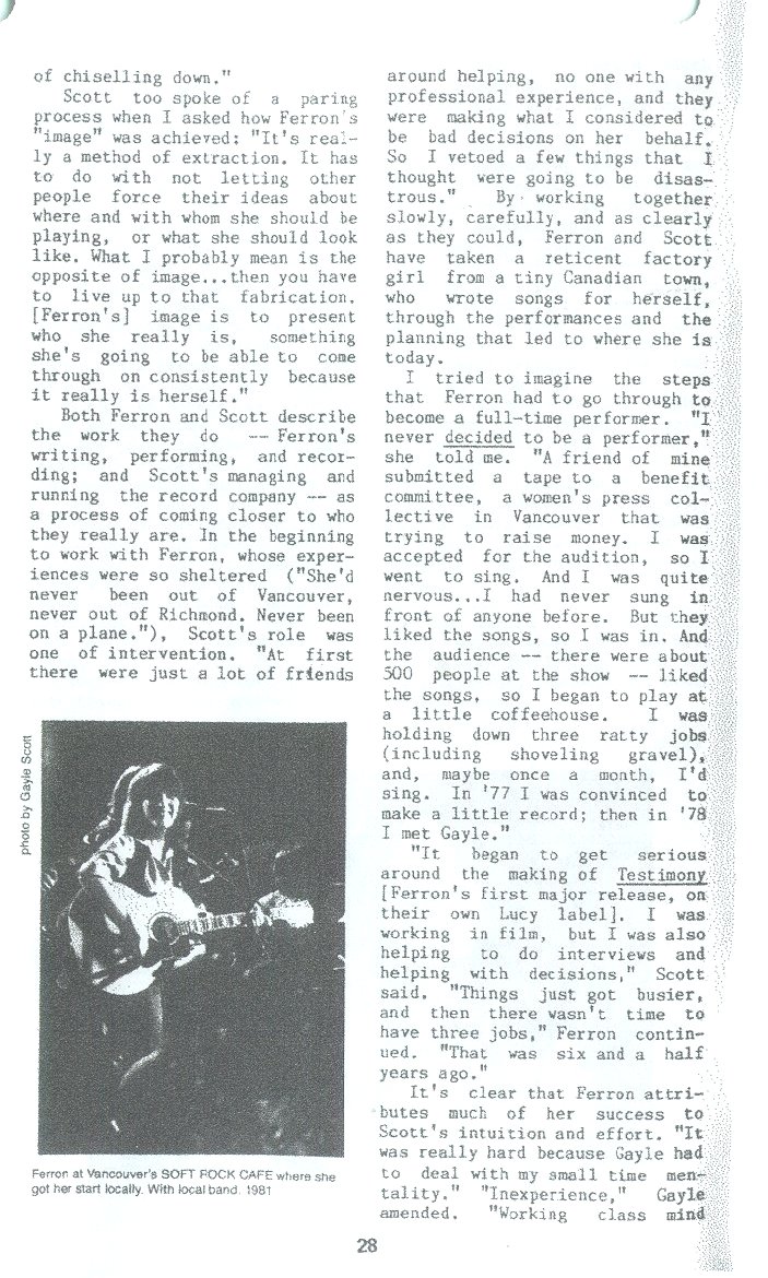 said that Still Riot was a near-perfect CD. So we brought it out, and within minutes I had hung myself, because they said there was nothing for the radio; they didn't want to do anything. It was kind of over. I was kind of amazed at how pleased I was with Ted Templeman's approval. I think that was the end of looking for approval. It devastated me that I had hung so much on that deal. Other CDs of my past were involved in it. It was hard to have taken the hook and then choked on it. I've gotten letters and people have come up to me, and I know there are girls out there who are struggling with some of the same issues that I struggled with or am still struggling with. So to know that it can help them, or to just be the support that they need, it's sort of an easy thing for me to do. So it's nice to be able to do that. AE: So the Ferron of today doesn't go in that direction? F: (laughs) No. There's one person that has to approve now, and that would be me. And it was that before that. There was a slight glitch in there that I guess I had to learn about. AE: One can hear a pedal steel guitar on "More Than That," "Already Gone," "Goat Path," and the title track, and an equally audible country feel to songs such as "Never Your Own." Have you gone Nashville on us? F: No. I probably was drawing from my natural inclination toward country music because I grew up with it. I never really knew rock that well. I suppose I could have put a mesmerizing rock thump under those songs, and managed to be as intimate. But, it wouldn't have fit the rest of the CD. I just let everything be what it was, like it was in the old days. The song tells you what it needs; you don't tell the song what it needs. I'm not a pop writer, and I'm not anticipating being on the radio or anything other than: there are some people in places all over the world who just want to know what I'm thinking about. It helps them. They tell me it helps them, and I think well, that's great, because it seems to help me too. AE: I think you're definitely someone who has a strong connection to the audience. The aforementioned "Goat Path" clocks in at over seven minutes, and there have been songs on your albums throughout the years that often exceed five or six minutes or more. What can you tell me about the significance of working in the long form? F: One: I don't have A.D.D., I don't have a problem trying to stay focused on something for a longer time. Some things can be said "cutesy" and "succinctly" and other things really can't. There is a kind of mood that you want to create to the music, with the music, that it just ends up being longer. AE: You can't create that kind of mood in two minutes. F: Well, you can. But, if it's a nice mood, why would you want it to end? It was a hard thing to talk about Betty (Spears), her dying, and how I felt about it (in "Goat Path"). Sometimes what happens is the first couple of lines start and they set the tone and the meter, and then I just try to adhere it. If I went back through that song I don't know what I could take out to make it shorter. It would be like if you wrote a letter and then you took out page three. AE: Everything belongs. You have been touring in support of Turning into Beautiful. What has that experience been like for you? F