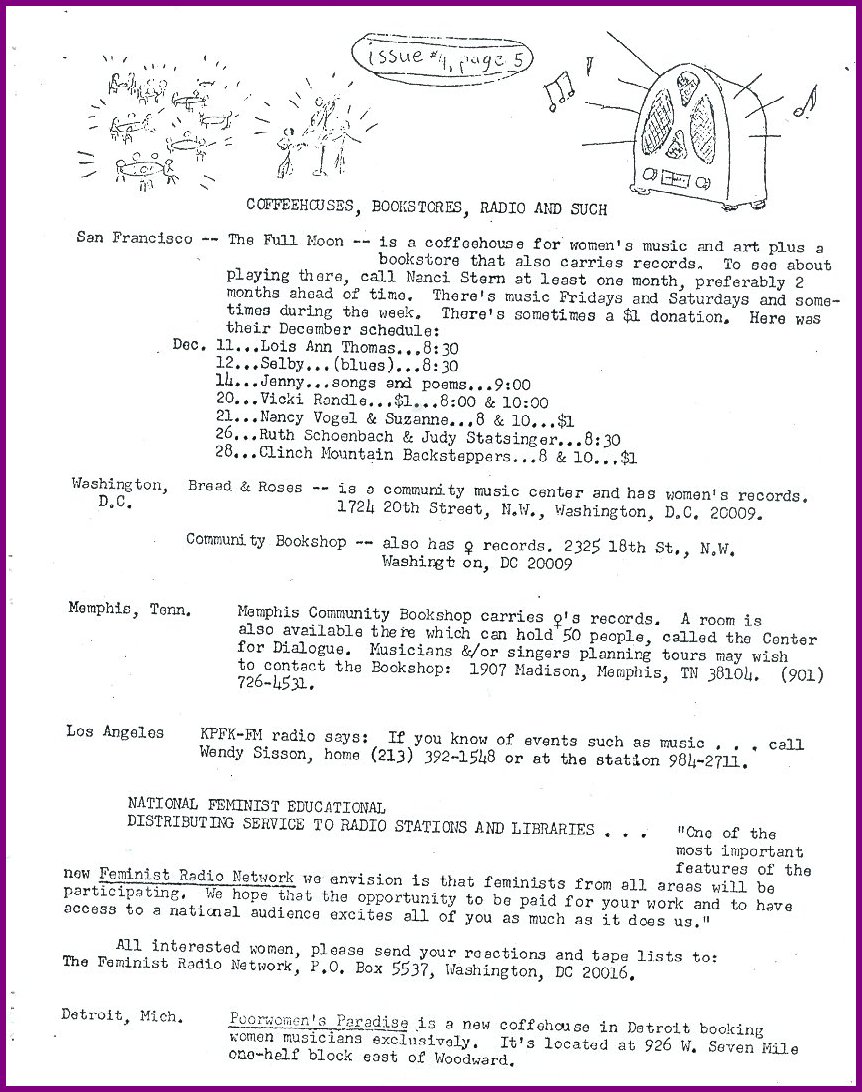 for the page above: Full Moon Coffeehouse, Vicki Randle, Nancy Vogl, Clinch Mountain Backsteppers, Bread & Roses, Feminist Radio Network, Poorwomen's Paradise