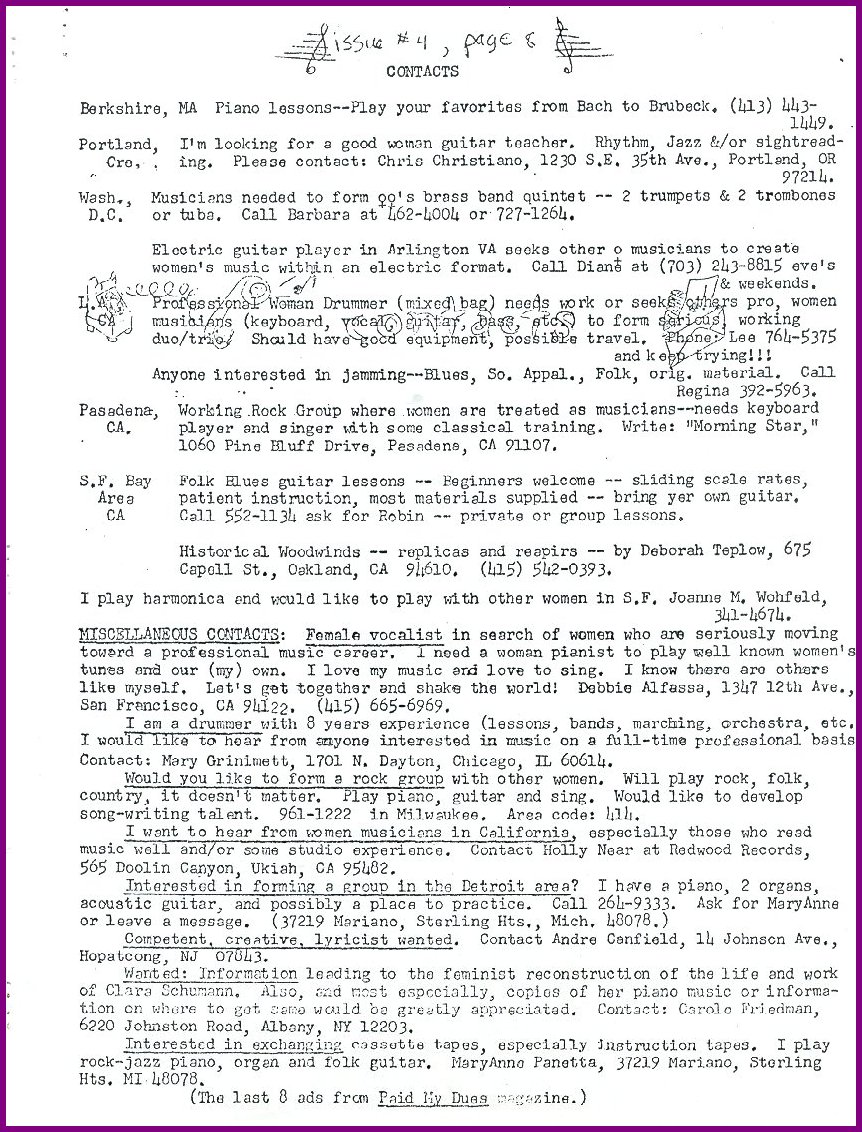 for the page above: New Haven Women's Liberation Rock Band, Raw Honey, Gertrude Stein Band, Deadly Nightshade, Helen Hooke, Anne Bowen, Pam Brandt, Ariel