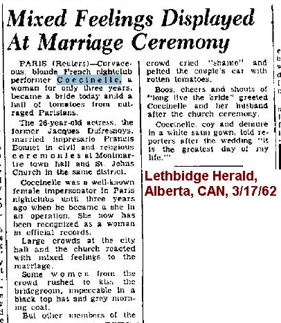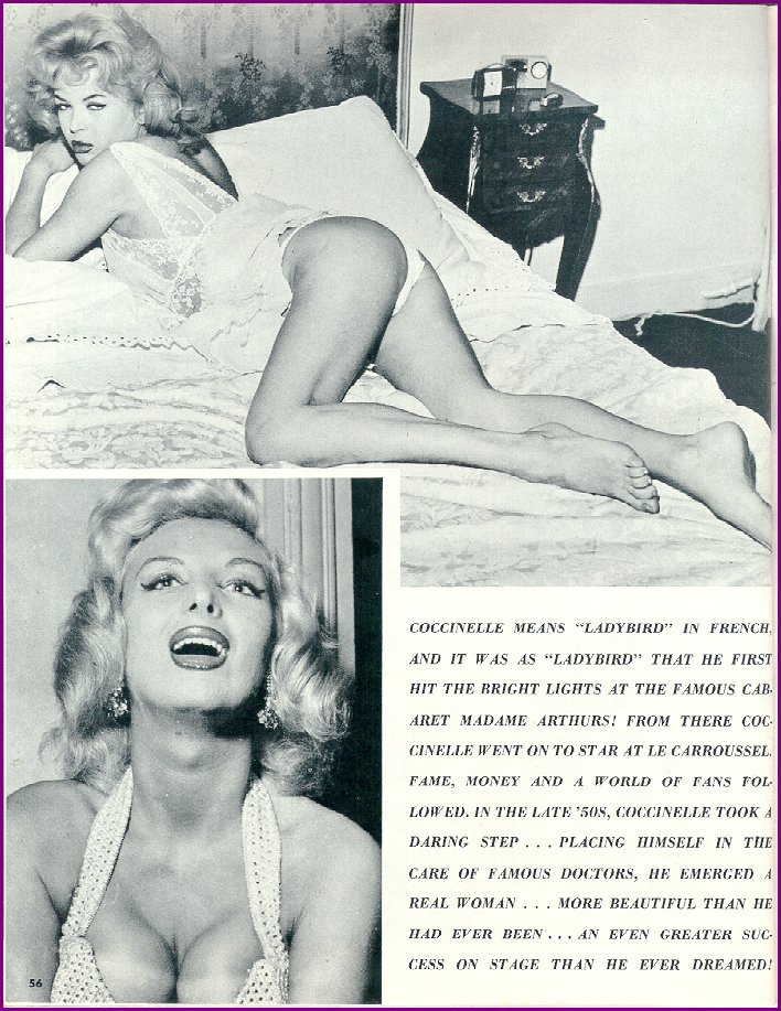 Coccinelle (1931 - 2006) PARIS (AFP) - (note, this is an internet translation from a French article, many of the pronouns in particular are incorrect) First mediatized transsexual, Ladybird, singer, actress and driving of review, died Monday evening (October 16, 2006) in Marseilles at the 75 years age, was, since its operation in 1958, pionnière and icon of the transgenre cause. She was hospitalized since the end of July in Timone following a cerebral vascular accident. Her funeral will be celebrated in the most strict intimacy Saturday in Marseilles, indicated one of her close relations. Born in August 1931, it lived in Marseilles since about fifteen years. It had founded association To become Woman (in order to come to assistance of the people wishing to change sex) and had taken part in the birth of Information and Research, Assistance the Center on Transsexualité and the Identity of Kind. According to the French law which recognizes the operated transsexuals --thanks to its own combat besides-- its marital status had been modified after its operation. Become Jacqueline-Charlotte Dufresnoy, it was regarded officially as born woman. Singer and driving of review, known abroad, Coccinelle had begun in 1953 At Mrs Arthur, celebrates Parisian cabaret transformists, with a song of Daniele Darrieux drawn from film First go ". Its last album, left in 2005, contained resumptions of songs of its reviews of Alcazar or Carrousel of Paris, in the Sixties where she knows one fulgurating notoriety but says herself wounded to be regarded as a phenomenon of fair. In 1963, Bruno Coquatrix crowns it star while making of it the driving one of review of Seek the woman. Ladybird will make a round in several European countries of which Germany and also in South America. In 1990, Coccinelle is last once at the poster in Paris, at the time of a spectacle assembled by Pascal Sevran with the Casino of Paris. It told how, one day of Carnival, being disguised with a red dress with black peas, had come to him the nickname from Ladybird. I did not feel transsexual, but in transit of sex, she said. It is by chance in round into 58, that I knew that a gynaecologist practised in Morocco a surgical operation which made of a man a woman. I thus went to Casablanca to meet the doctor who was going to rectify this error of the nature of which I was victim. Lastly, I was going to be a true woman, in perfect harmony, interior and outside! After the operation, he told me +bonjour Miss! + I was reassured, it told. When the journalists knew it, I was with the one of all the magazines, which made the fortune of the surgeon. And superstar propelled me! I was the first to have changed sex into France. Incredible! But true, that added which married three times, after the modification of its marital status. In 1960, it marries a sports correspondent. The first marriage of a transsexual attracts the media of the whole world. Divorced two years after, it remarie in 1963. It contracts a third union in 1996, in Marseilles, with Thierry Wilson. Jacqueline-Charlotte Dufresnoy signed in 1987 her autobiography Ladybird by Ladybird (Daniel Filipachi). Jean Tinder,