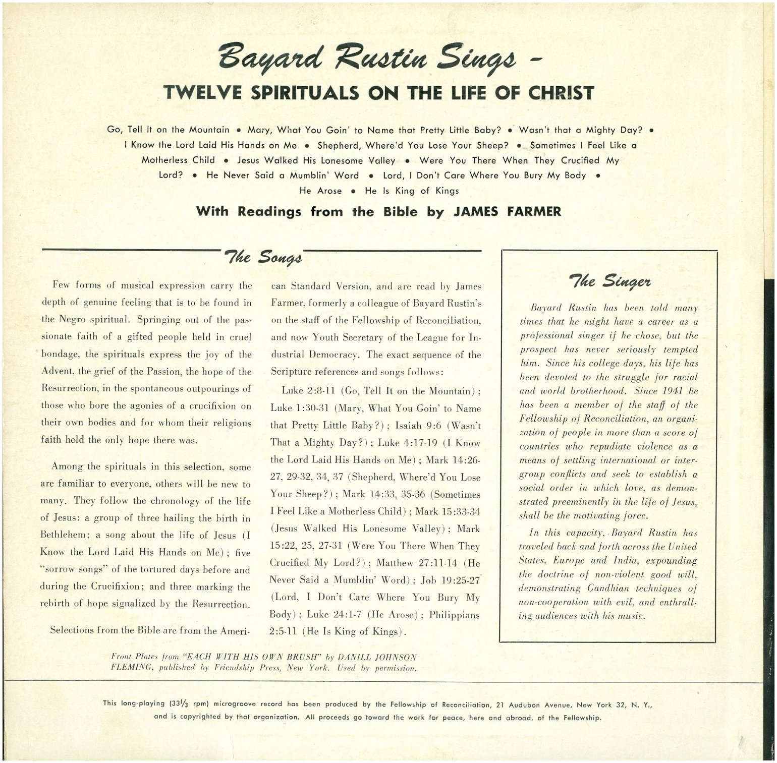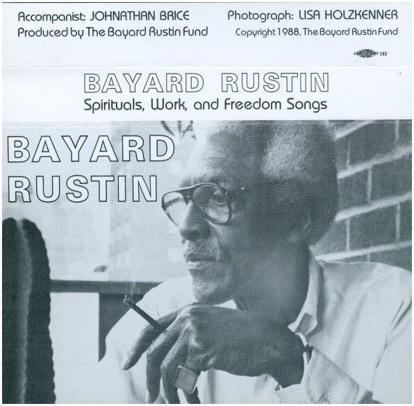 Bayard Rustin Sings Most of you (I hope) know a little of the history of Bayard Rustin, and may have seen the headlines in Feb 2020 when California Governor Gavin Newsome posthumously pardoned Rustin for his 1953 arrest and misdemeanor sodomy charge. That shadow hung over him during all the years he worked with Dr Martin Luther King Jr as a champion in the Civil Rights Movement. The shadow kept him more to the sidelines although he worked as an influential advisor to King. Working for many causes in his life he finally became involved in gay rights activism in the 1980s. In 1982 as a means of protecting his partner Walter Naegle, he adopted him, the only way then to form a legal bond for their relationship. And in 2013 President Obama posthumously presented to Naegle, in Rustin's behalf with the Presidential Medal of Freedom. Since his death in 1987, Bayard Rustin has been honored with many awards even including buildings being named after him, and he has been the subject of books and documentaries. But did you know Rustin was a singer? Back in his college days, at Wilberforce College (Ohio) he sang and toured the country with the Wilberforce Quartet. He was already a Civil Rights activist when he recorded two 10" vinyl albums around 1952, singing spirituals and Elizabethan songs. In 1973 a benefit concert for the Young People's Socialist League, NYC, was recorded, with Rustin talking about the songs. That was entitled "Spirituals, Work and Freedom Songs," and was released on a cassette tape.