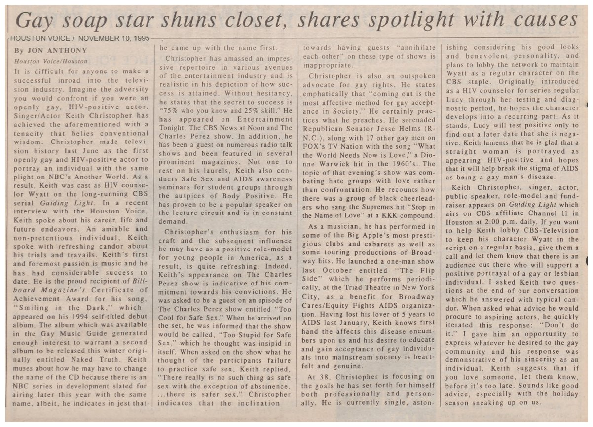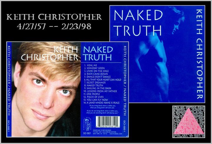 Weigle - If It Wasn't Love (1998) That last song, called "I Remember" came from Mark's 2002 album "Out of the Loop." Keith Christopher was an actor, singer and activist who died in 1998. His only album, "Naked Truth," was completed after his death. He was a friend of Michael Callen's and in 1987 Michael asked him to sing backups for him at the March on Washington. It was there that Keith first saw the Names Project Memorial Quilt, and that experience led to his song "Pieces of Lives.' Keith Christopher - Piece of Lives (1998)