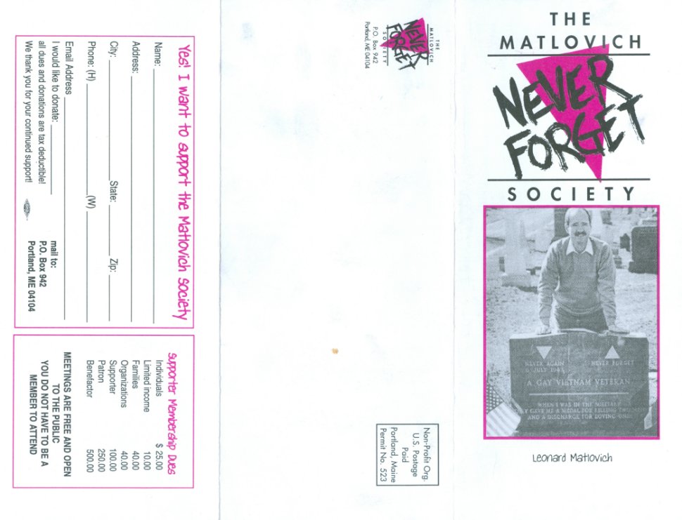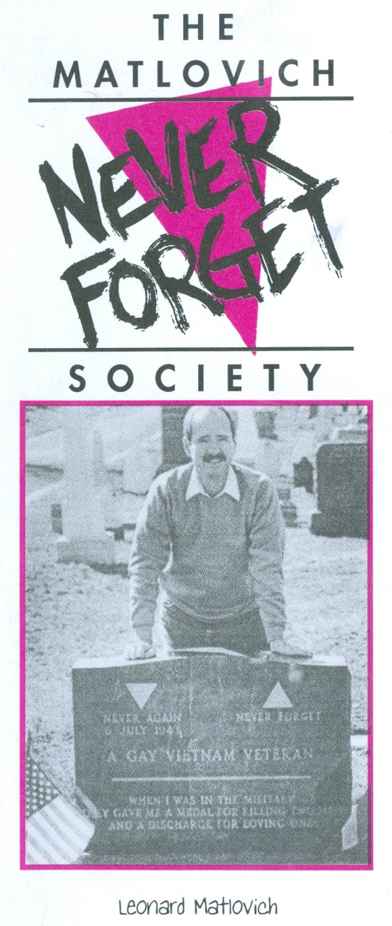 that can provide you with information http://www.leonardmatlovich.com/ http://www.findagrave.com/cgi-bin/fg.cgi?page=gr&GRid=2660 http://www.paulsgaystamps.com/The%20Modern%20Age/The_Modern_Age_Leonard_Matlovich.htm http://entertainment.msn.com/movies/movie.aspx?m=139975 Below, for a few years there was a Leonard Matlovich Society Below, a larger scan from the flyer...apparently Leonard posed behind his tombstone