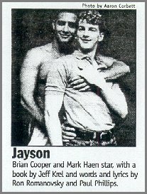 "Jayson," the Musical Jeff Krell is a comic strip writer who created the groundbreaking strip "Jayson," which debuted in the "Philadelphia Gay News" in 1983. By 1985 "Jayson" had achieved wide popularity with its appearance in "Gay Comix," where the strip was named Most Popular Feature. In 1995 Krell began collaborating with Ron & Paul on a "Jayson" stage musical. After some workshop performances the off-Broadway debut was on July 10, 1998, at The 45th Street Theatre, and the "New York Times" praised it for its "tart, keenly observed humor." Several R&P songs were used in the show, including "My Mother's Clothes." While the show did not have a long run, it got a generally kind review, which you can click to see. |