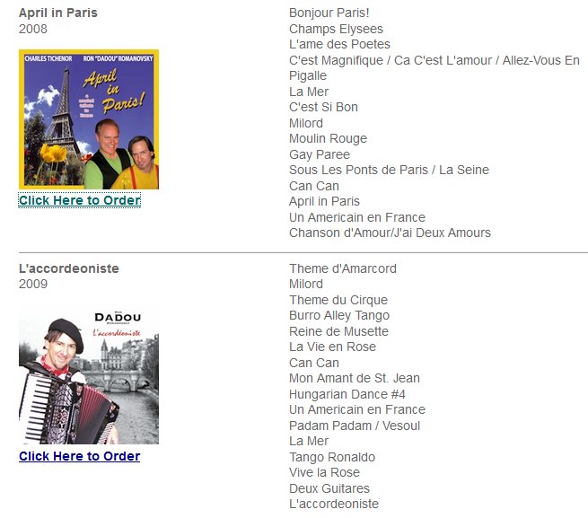 Above, Ron played accordian on the 2001 album by Busy McCarroll. It had the unlikely title of "Bar'Bar'ella~The BeatNik Spy Music Files" ...click on the pix for more info. |