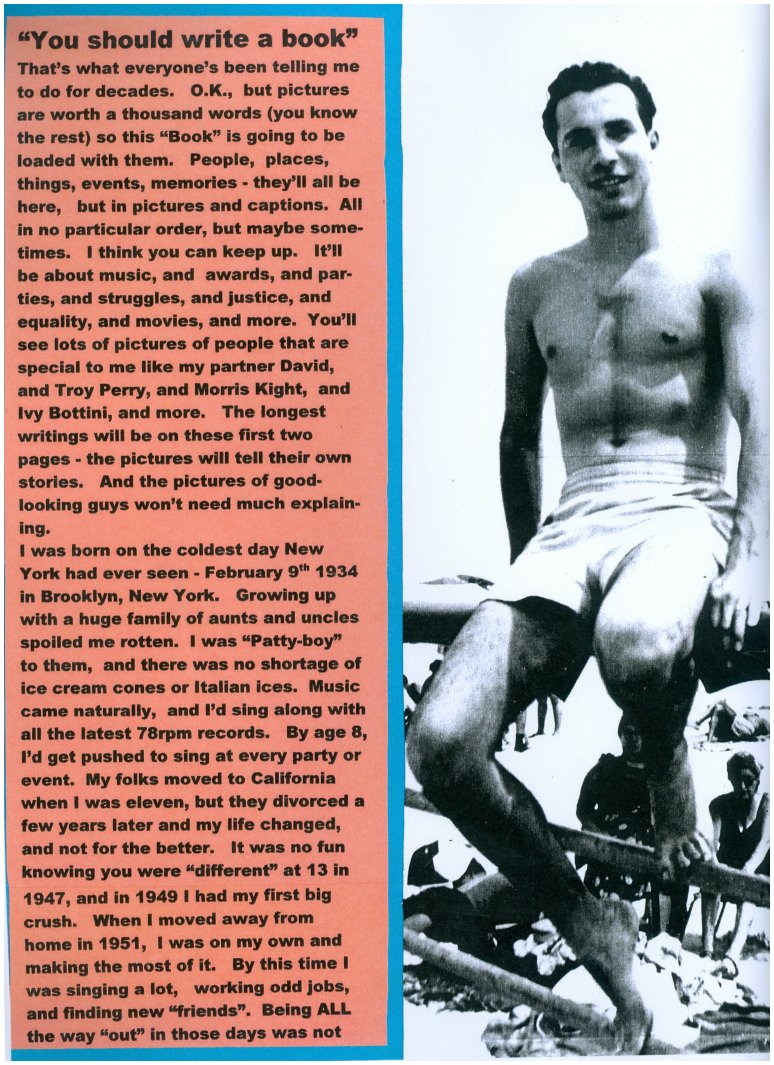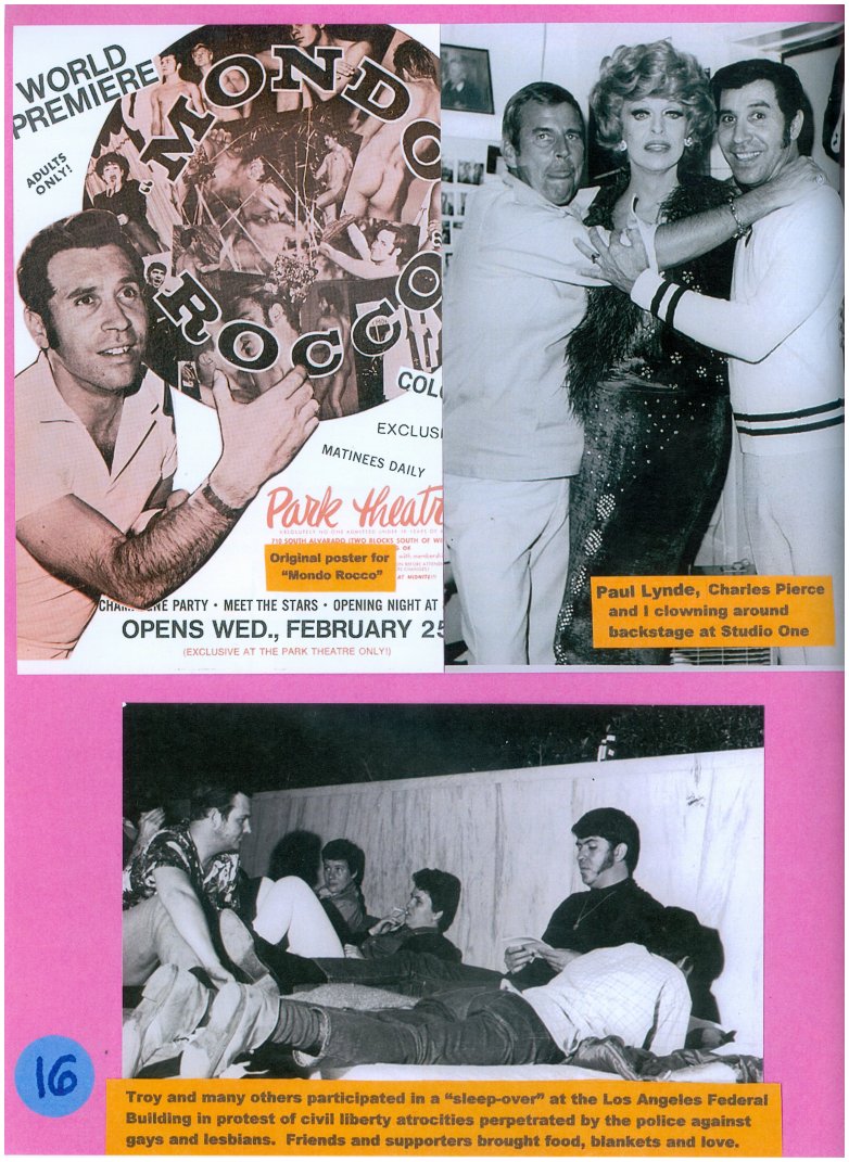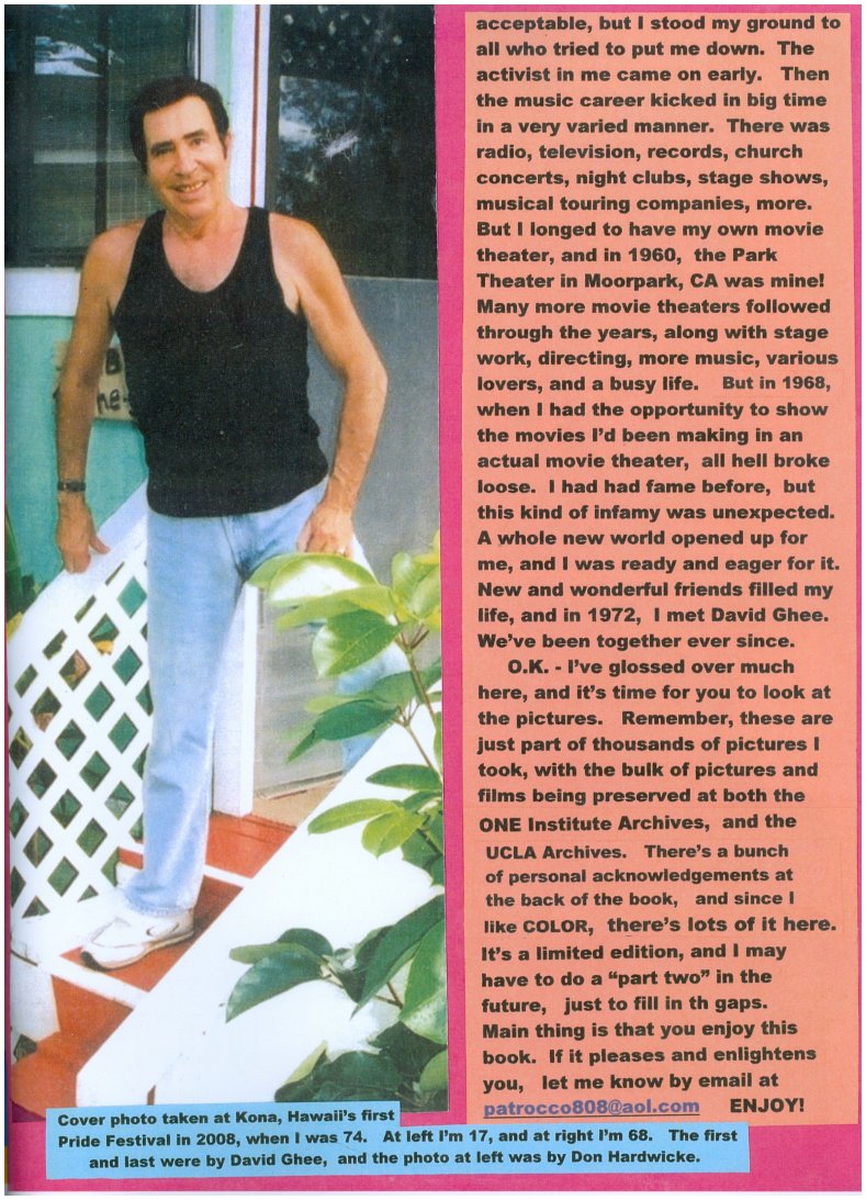 Back to Pat Rocco Introduction The Book: "Pat Rocco Dared" I'm so pleased that Pat sent me a copy of his photo book, and I immediately wrote him that a copy belongs in every GLBT archives...it is Packed full of history, including photos of a who's who of our activist history: Harvey Milk, Morris Kight, Troy Perry, Ivy Bottini, and many many more. He gave me permission to scan some of the pages, and it was difficult to limit myself to just these, as every page is a delight.