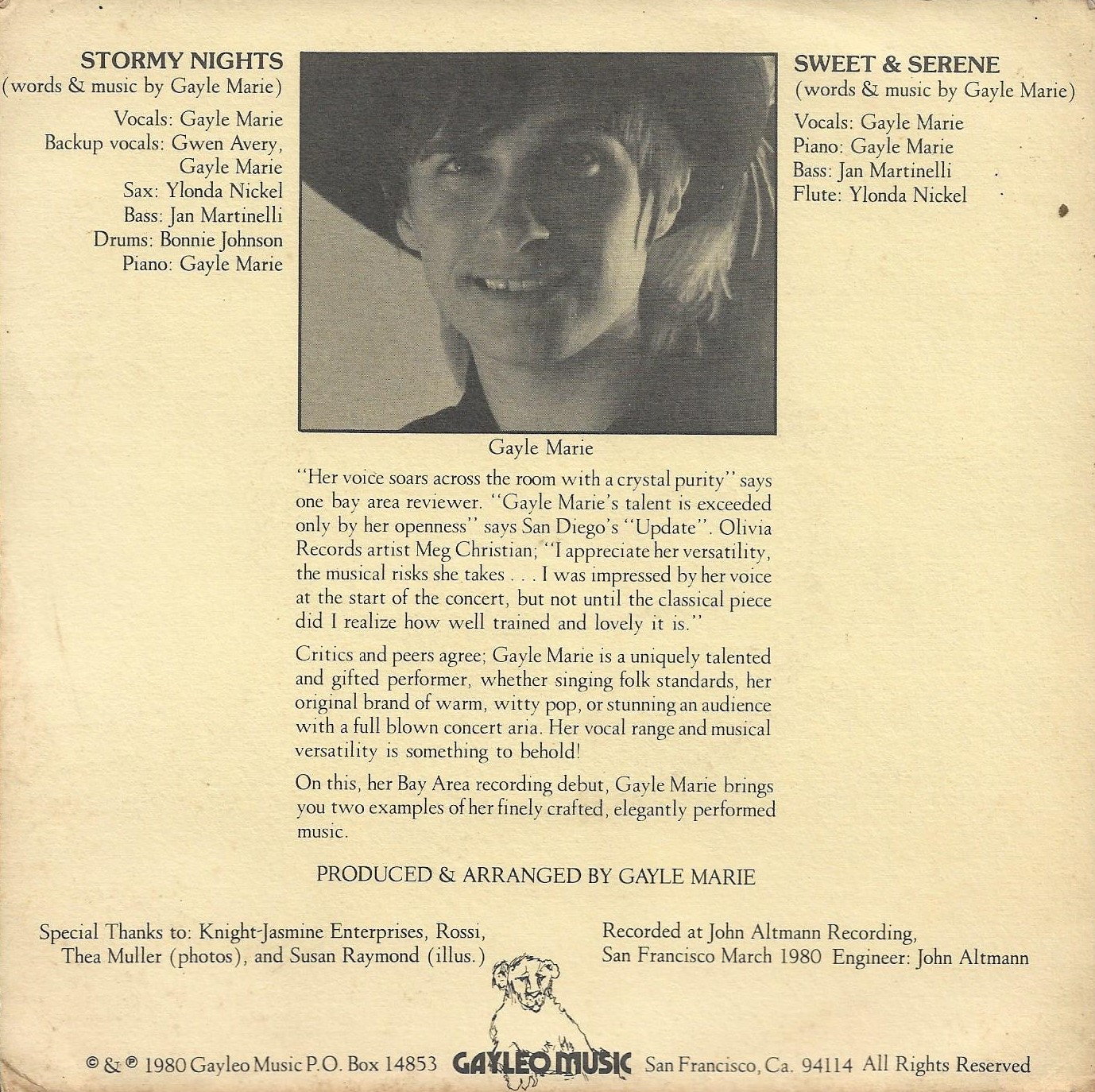\And that was Gayle Marie and a track from her 1982 album, "Night Rainbow." It was called "Stormy Nights," and she got some help on backups by Gwen Avery. And, you heard Teresa Chandler & Karen Ripley on Part 2 of the show, when I played a song from their 1994 cassette "I Survived a Femme." This time I'm sharing with you the title track. Teresa