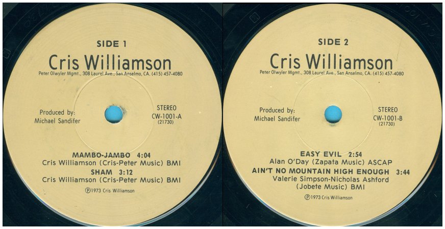 This is JD Doyle and I'm winding down Part 1 of my special show Lesbian Music Obscurities, and as promised at the start, I've got the other two songs from that very rare Cris Williamson EP from 1973. First you'll hear one called "Mambo Jambo," done kind of in the vein you would expect, and the other song, which was the name of a horse, "Sham," is a bit more high spirited, and was done live before an audience. That one was re-recorded in 1978 for Cris' LP "Live Dream." Here are "Mambo Jambo" and "Sham." Cris Williamson - Mambo Jambo / Sham (1973)
