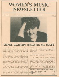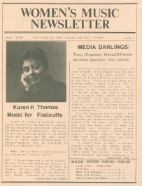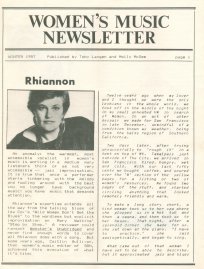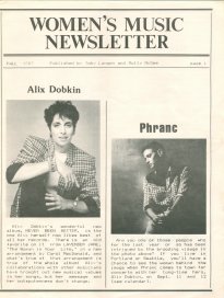 This was a regional, quarterly newsletter published out of Seattle by Toby Langen and Molly McGee, and included "reviews of new record releases as well as profiles and interviews with performers and others involved in the production of women's music and culture." I have eight issues in my collection of the eight-page publication, and as copies did not contain a volume number I cannot tell if any copies preceded the first one I have, if there are gaps in the series I do have, and I do not know if others followed. My copies span from "Fall 1987" to "Winter 1989." And it is curious that two issues were dated "Winter 1987," and "Sept 1988" and "Fall 1988," would appear to overlap. If you can provide more information about this publication, or even scans of additional isues, please email me so I can share the information. Every issue has been scanned, all 66 pages, and you can click each link or issue cover. |